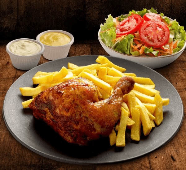 1/4 De pollo, papas, ensalada más porción de arroz chaufa.