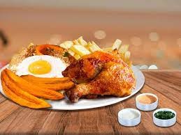 1/4 De pollo, papas, ensalada, porción de arroz chaufa, huevo frito más plátano frito.