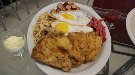 Broaster, hot dog, chorizo, huevo, papas más ensalada.