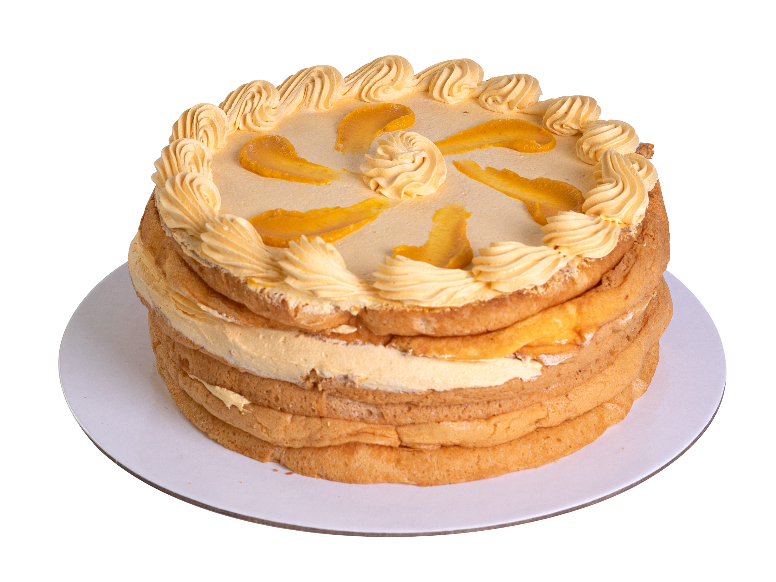 Bizcochuelo de vainilla, crema de maracuyá y mango, decorado con crema de mango y mermelada de maracuyá.