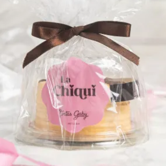 Chiqui lúcuma tres leches más papel celofán cristal 70x70 cm y cinta satinada 1 cm marrón.