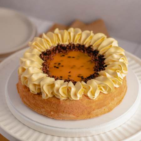 Keke de vainilla, crema de maracuyá y crema chantilly sabor maracuyá. 12 Porciones.