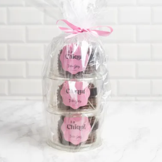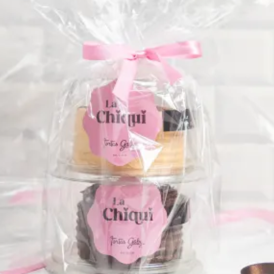 C}hiqui chocolate, caja mini mini más brownie, orejitas, bizcotelas, 4 mini cupcakes, bolsa polipropileno 4x8x2 y cinta de agua.