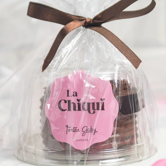 Chiqui tres leches, chiqui chocolate más papel celofán cristal 70x70 cm y cinta satinada 1 cm rosado.