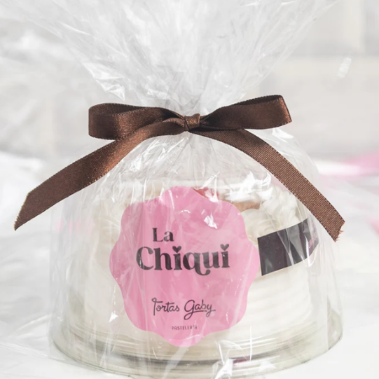 Chiqui tres leches y papel celofán 70x70 cm más cinta satinada 1 cm marrón.
