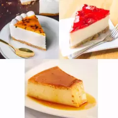Porción de crema volteada*1 + Porción de cheesecake de fresa*1 + Porción de cheesecake de maracuyá*1