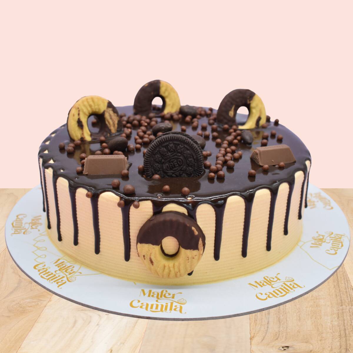Queque de chocolate húmedo, relleno de crema de Oreo, cubierto con chantilly sabor a galleta Oreo, decorado con chocolatería y galletas Oreo.