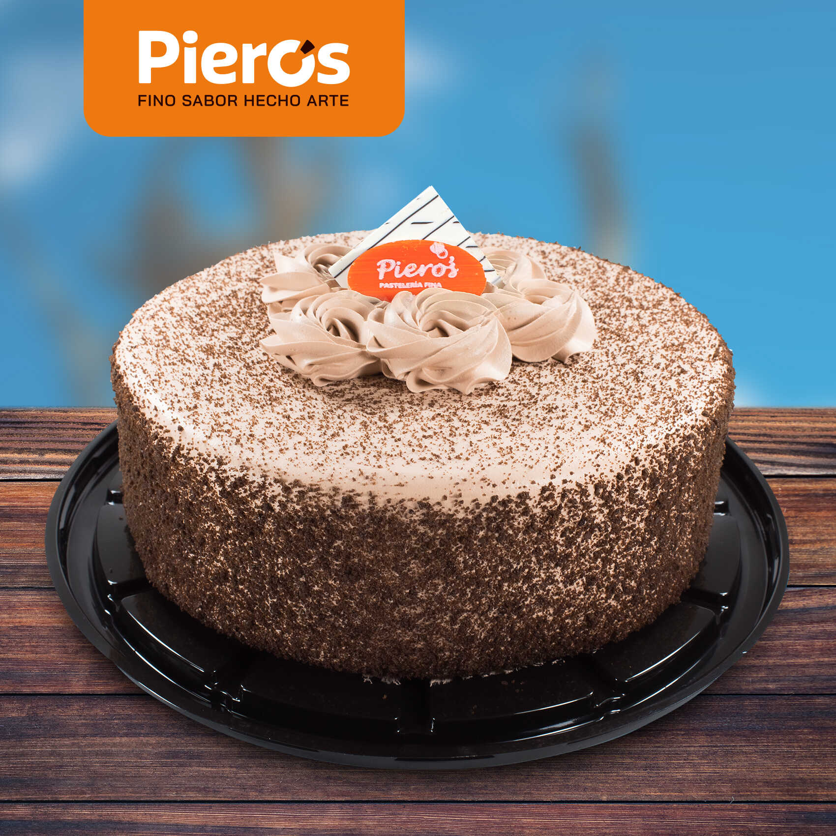 Bizcochuelo de vainilla, bañado con nuestra receta de 4 leches sabor café, relleno de crema de café, cubierto con chantilly sabor café y decorado con filigrana de chocolate.