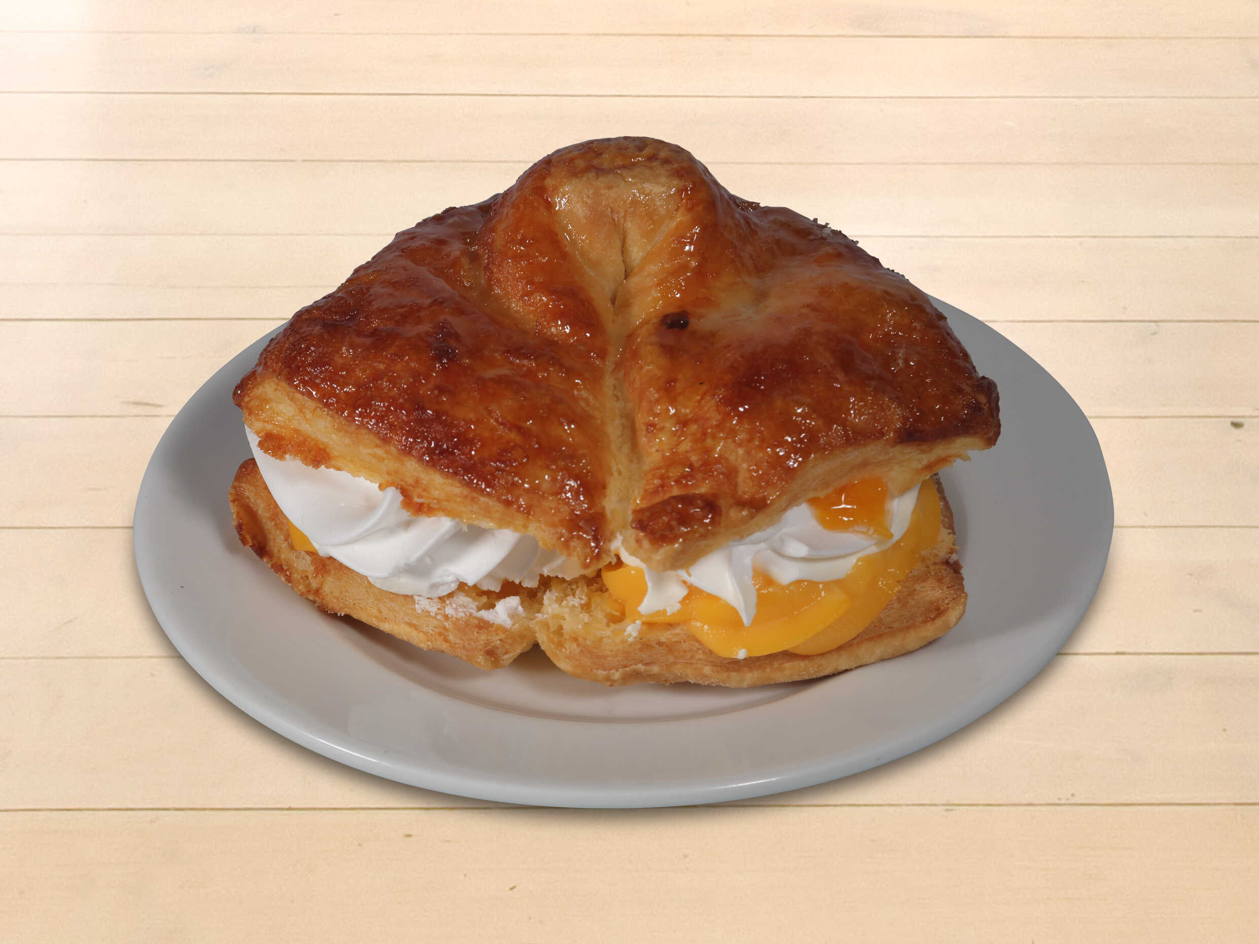 Pan acaramelado relleno con crema pastelera, chantilly y durazno.