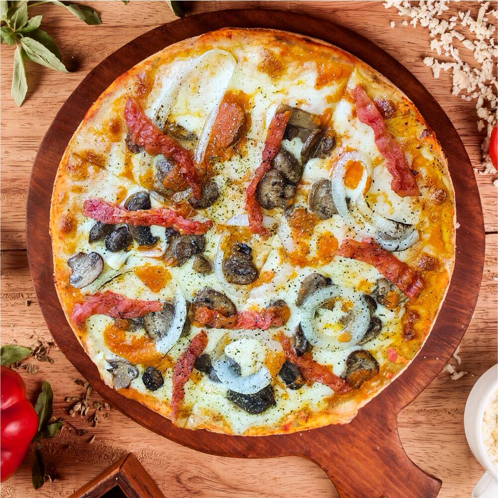8 Slices. Tocino crocante, champiñones salteados, tomate fresco, aceite de ají y perejil.