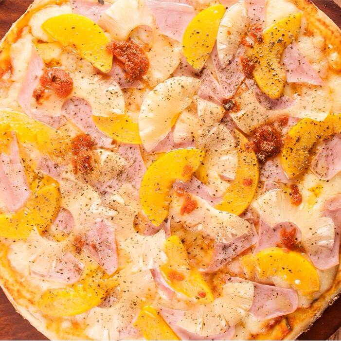 8 Slices. Piña, durazno, salsa de tomate, jamón inglés y mozzarella.