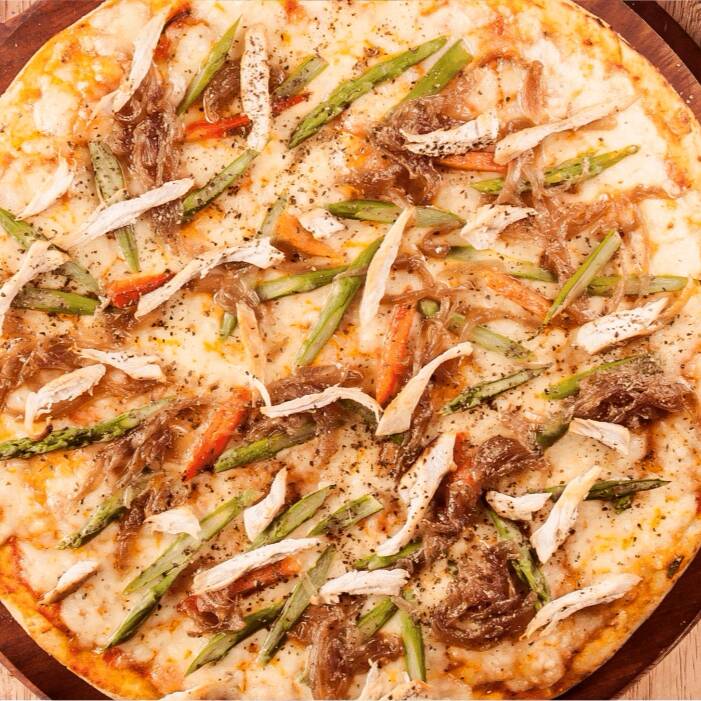 8 Slices. Pollo a la juliana, espárragos verdes frescos y cebolla blanca caramelizada.