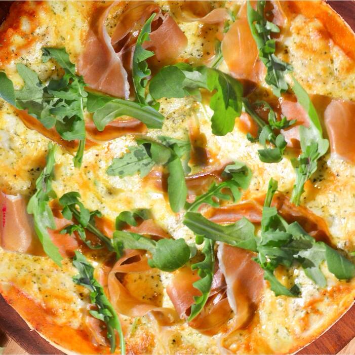 8 Slices. Mozzarella, prosciutto di parma y arúgula fresca.