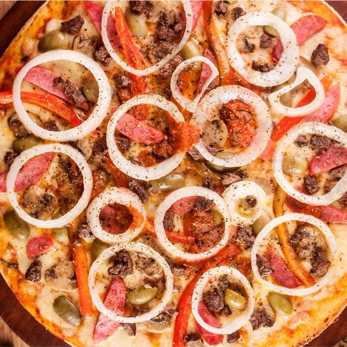 8 Slices. Lomitos de res fritos, chorizo, aros de cebolla, pimiento, aceitunas, ajo, salsa de tomate y champiñones.