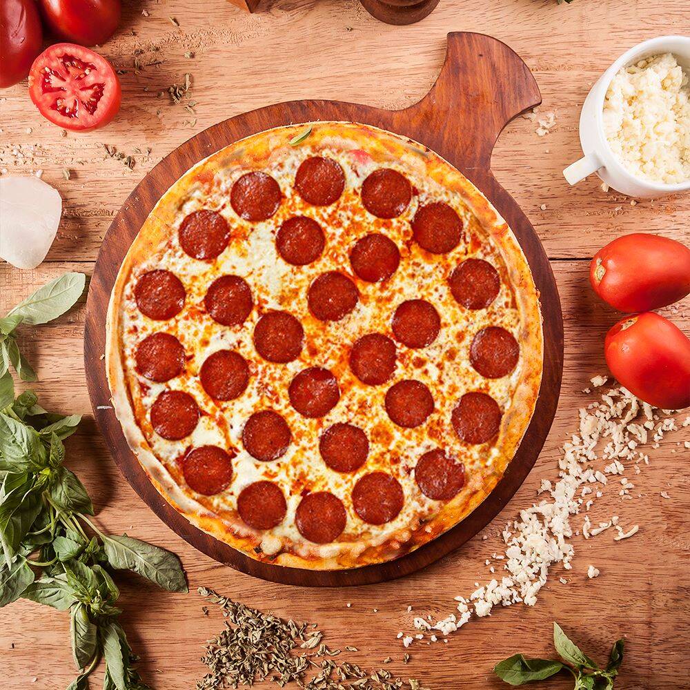 8 Slices. Pomodoro, pepperoni picante, queso mozzarella, aceite de oliva y orégano.