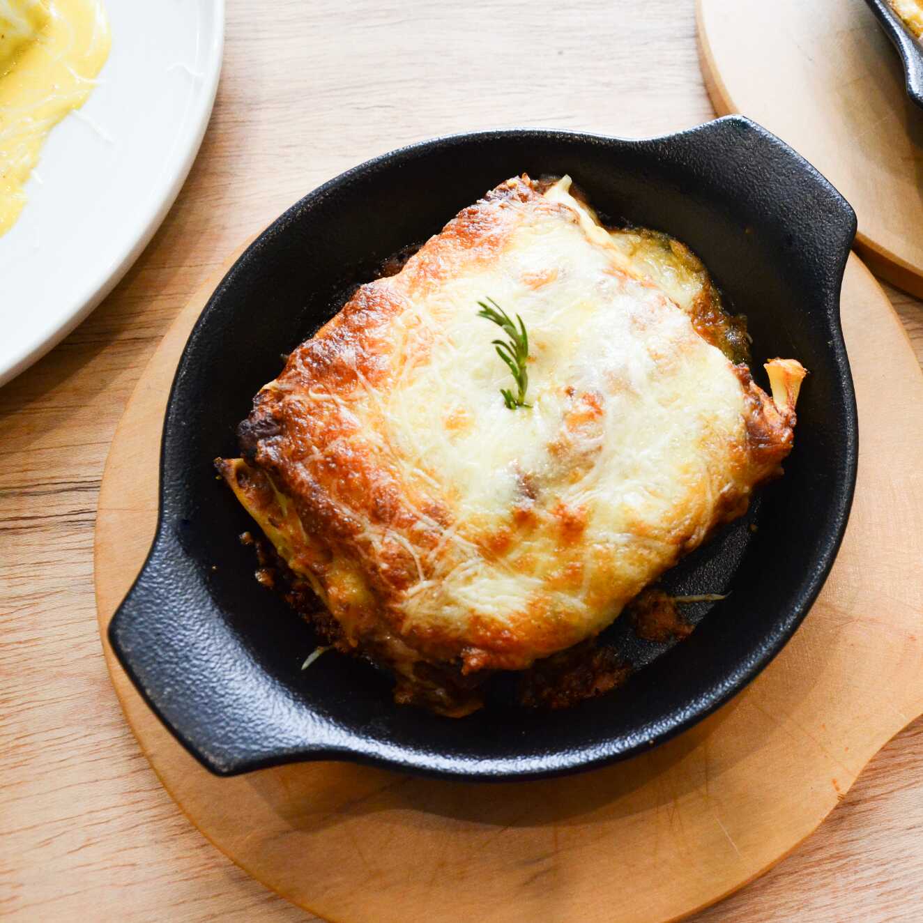 Salsa de carne y bechamel, queso mozzarella y parmesano.