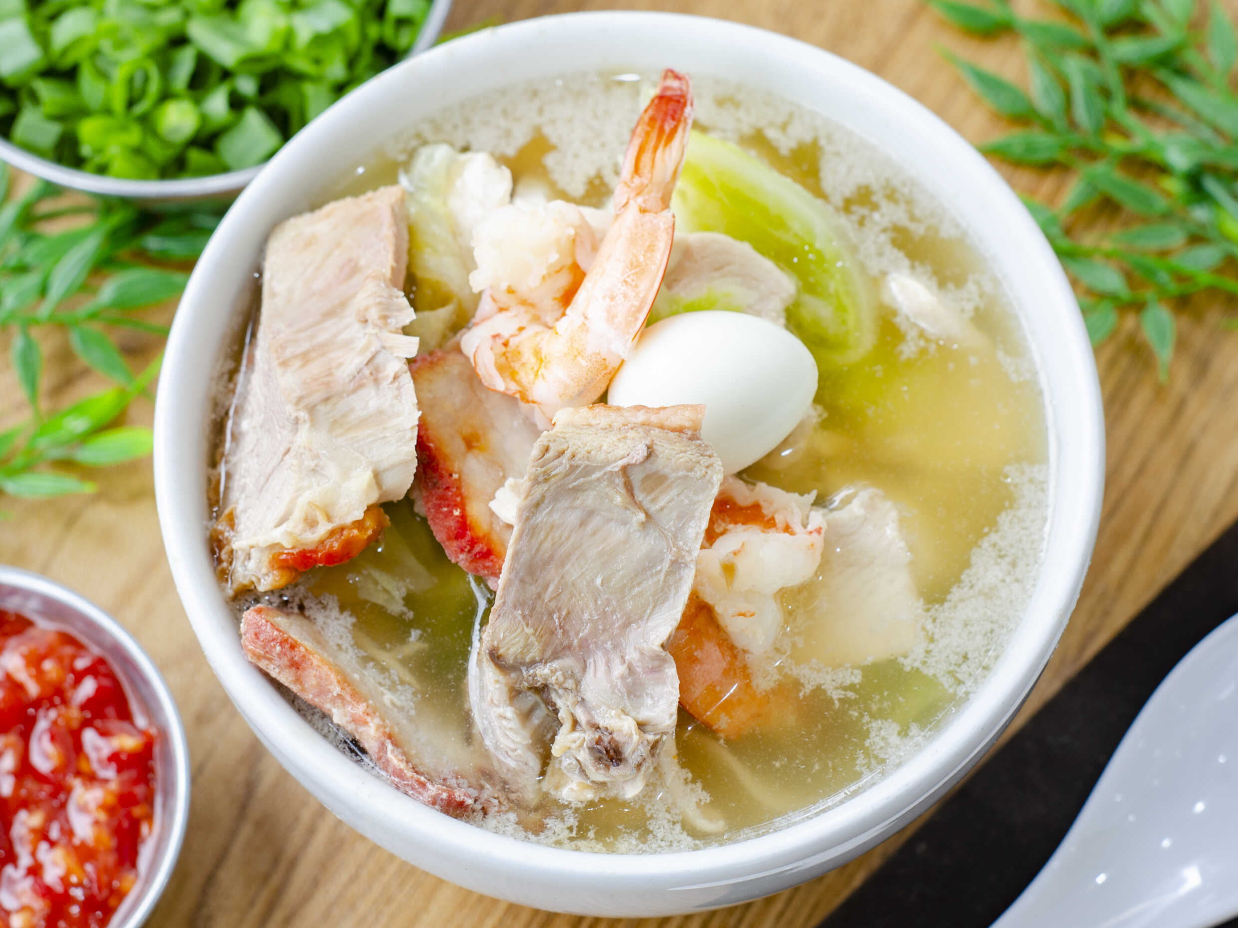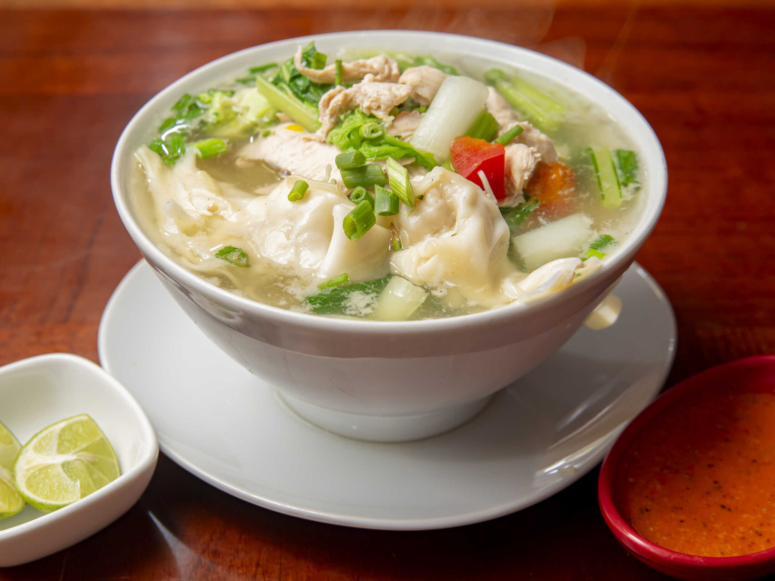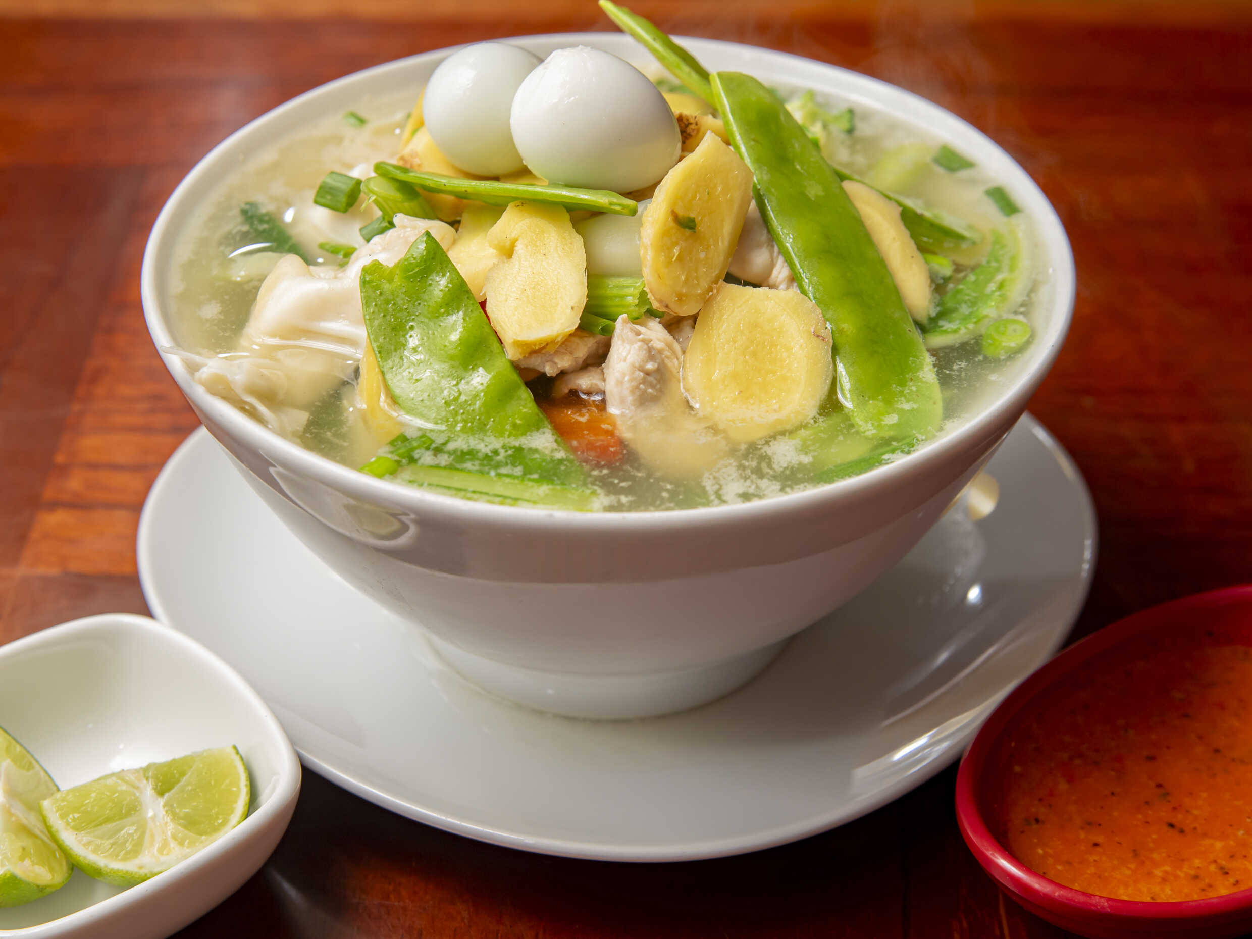 Pollo, chancho, fideos, wantanes, col china y jengibre.