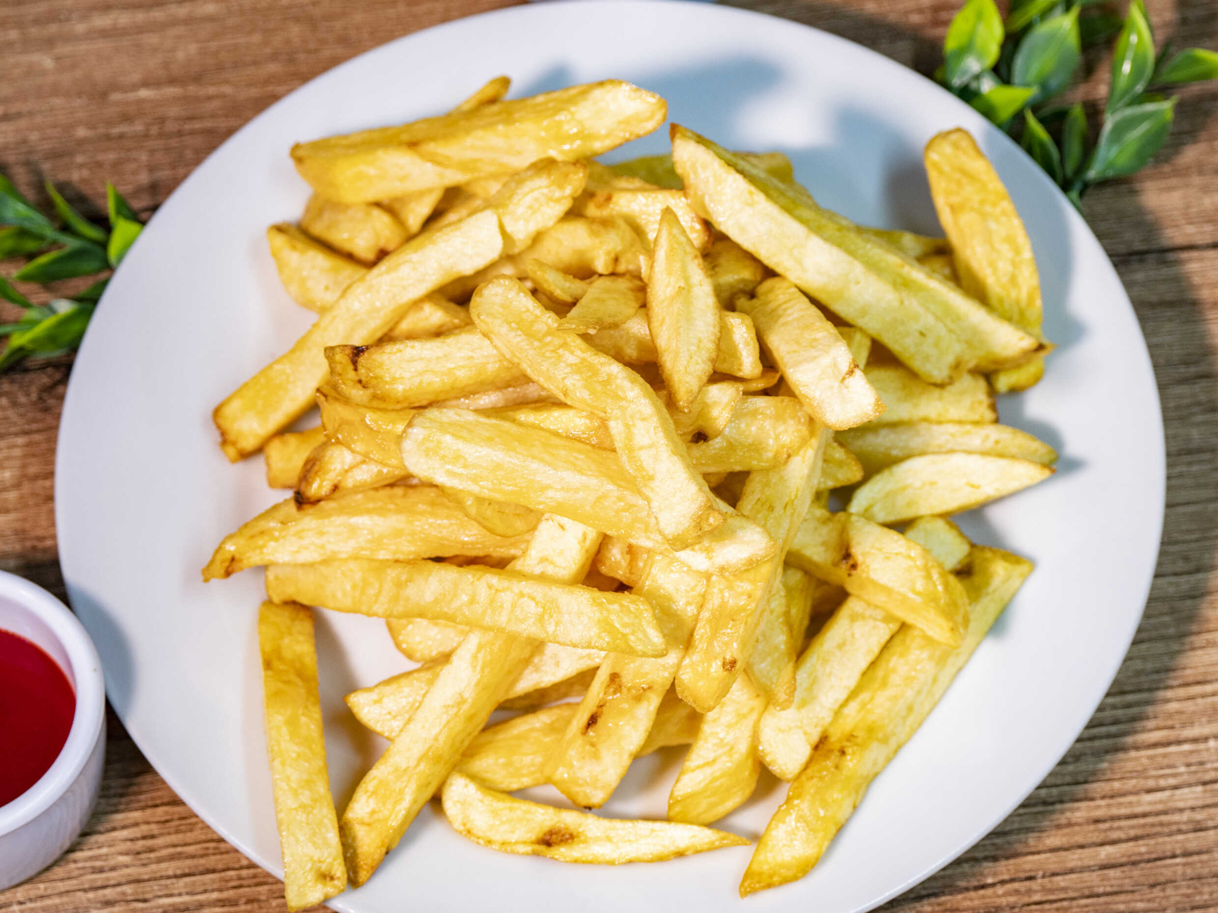 porción de chaufa más fideos chinos bañado en salsa de ostión acompañado de pollo, carne, chancho y langostino.Incluye sopa wantán o wantán frito.