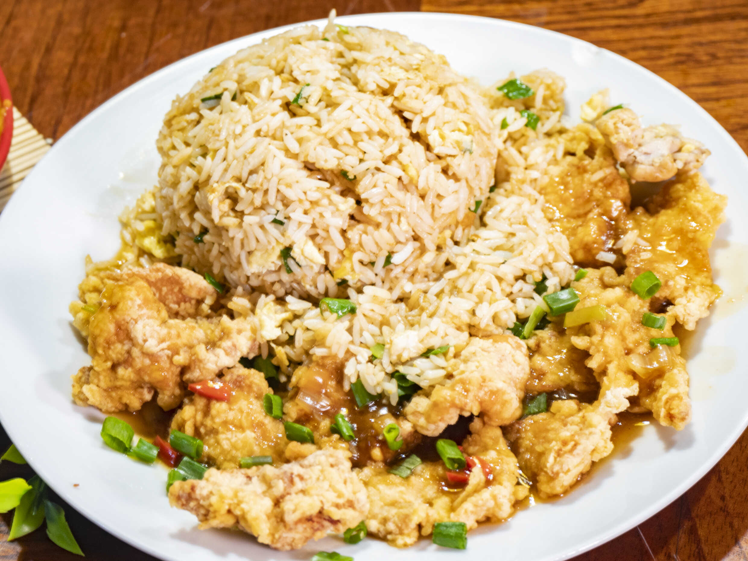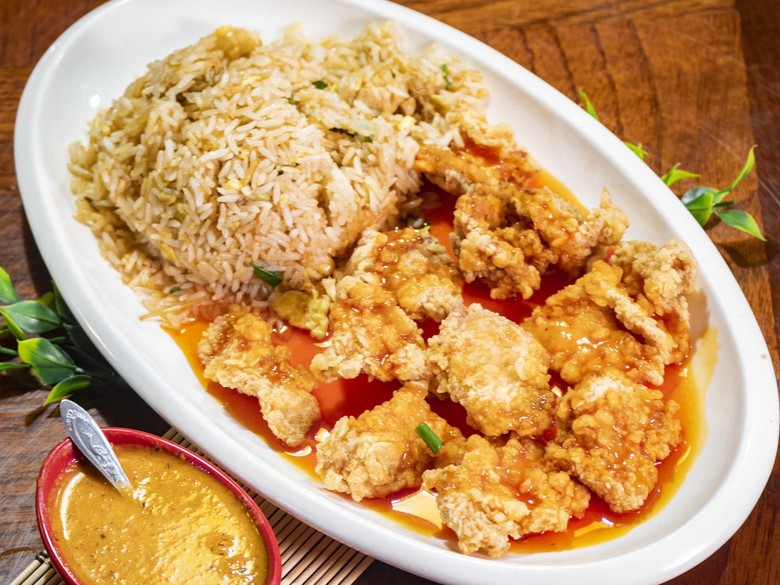 Chaufa y pollo limonkay. Incluye sopa wantán o wantán frito.