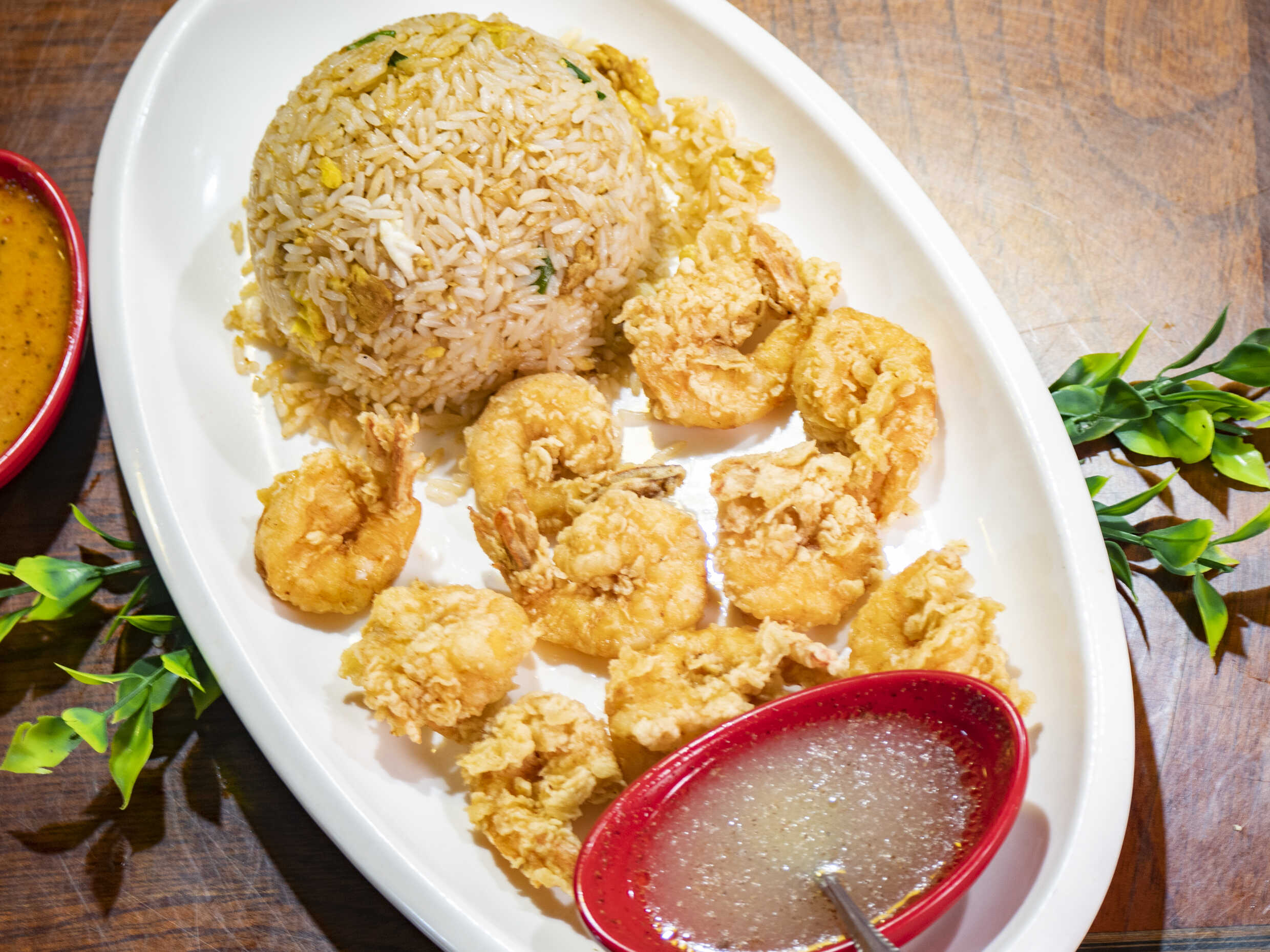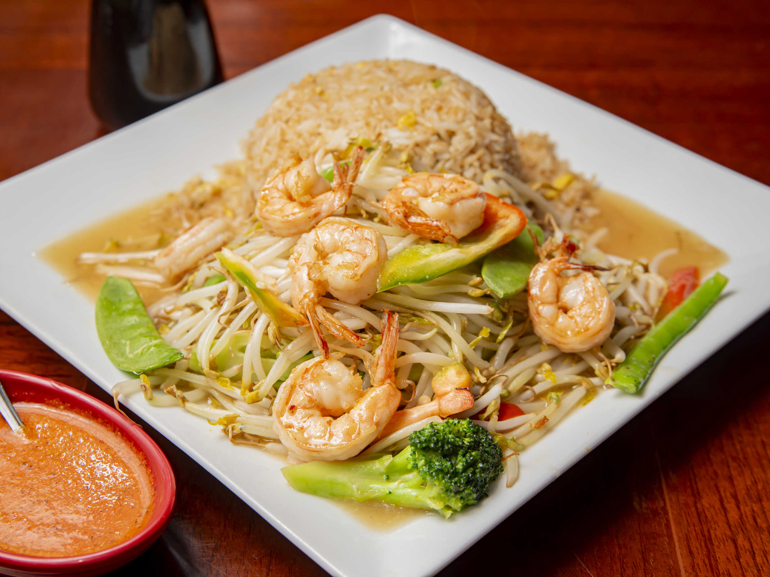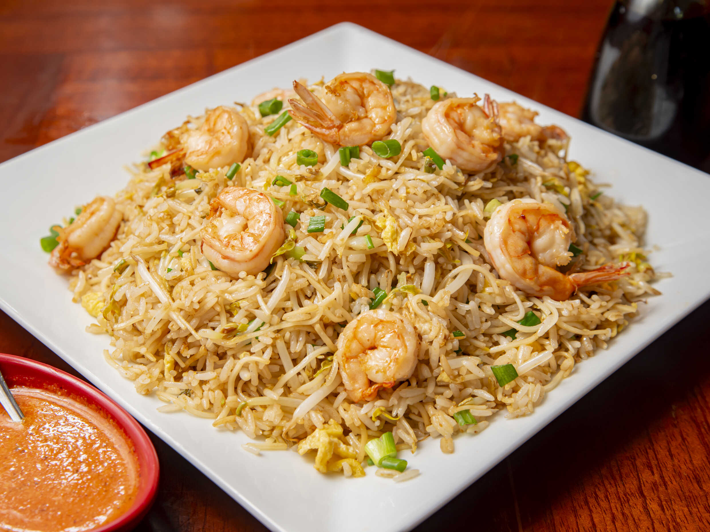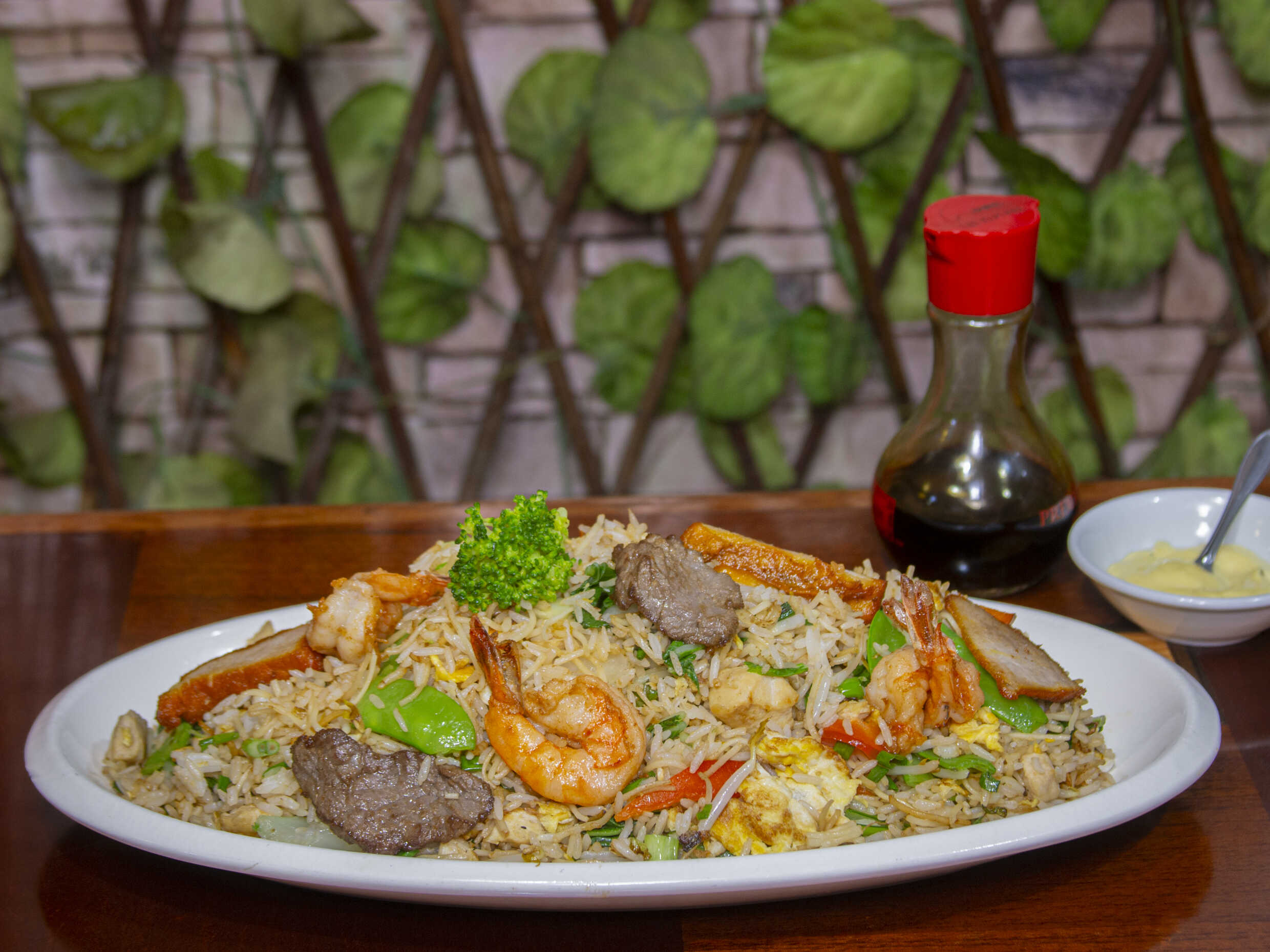 Arroz chaufa de langostinos, combinado de frijol chino y tallarín. Incluye sopa wantán o wantán frito.