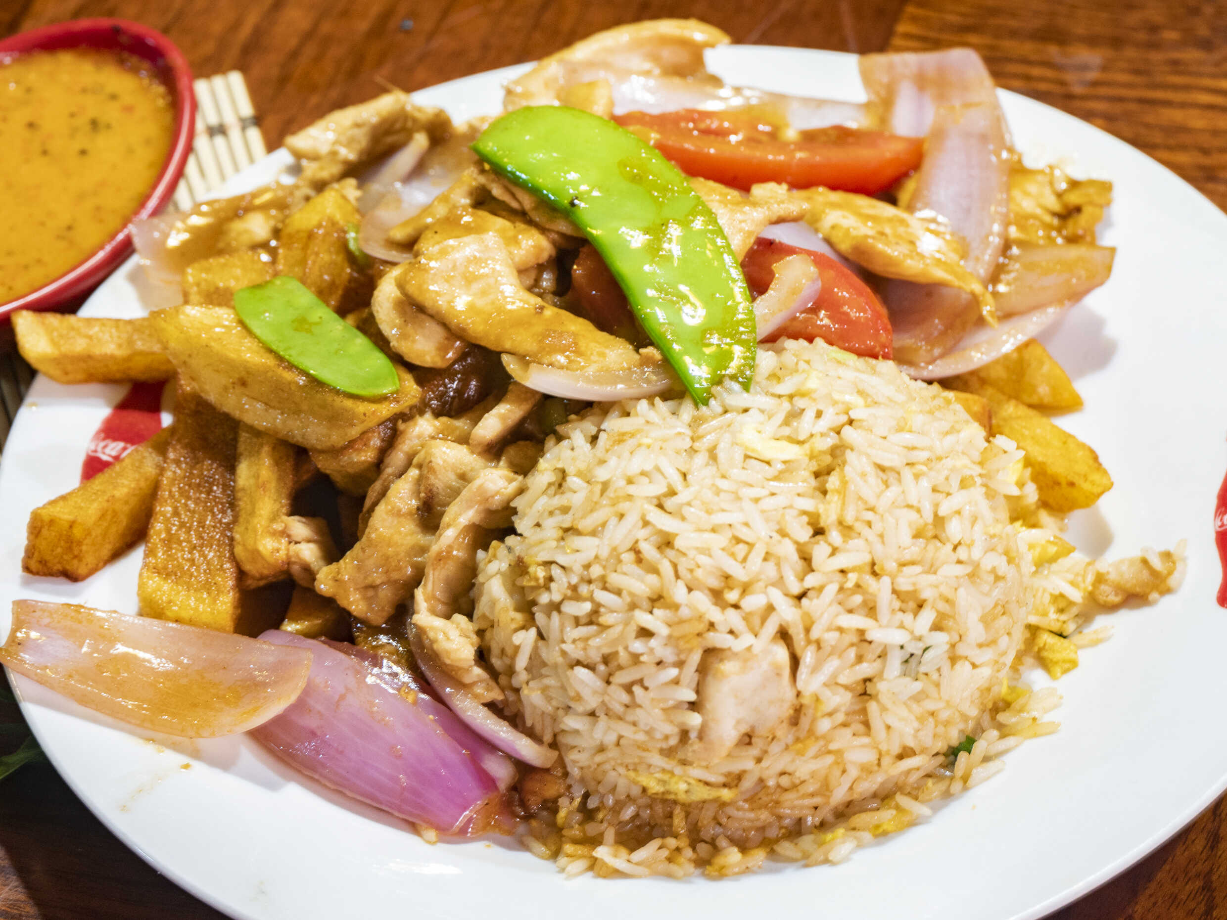 Arroz chaufa de pollo, combinado de frijol chino y tallarín. Incluye sopa wantán o wantán frito.