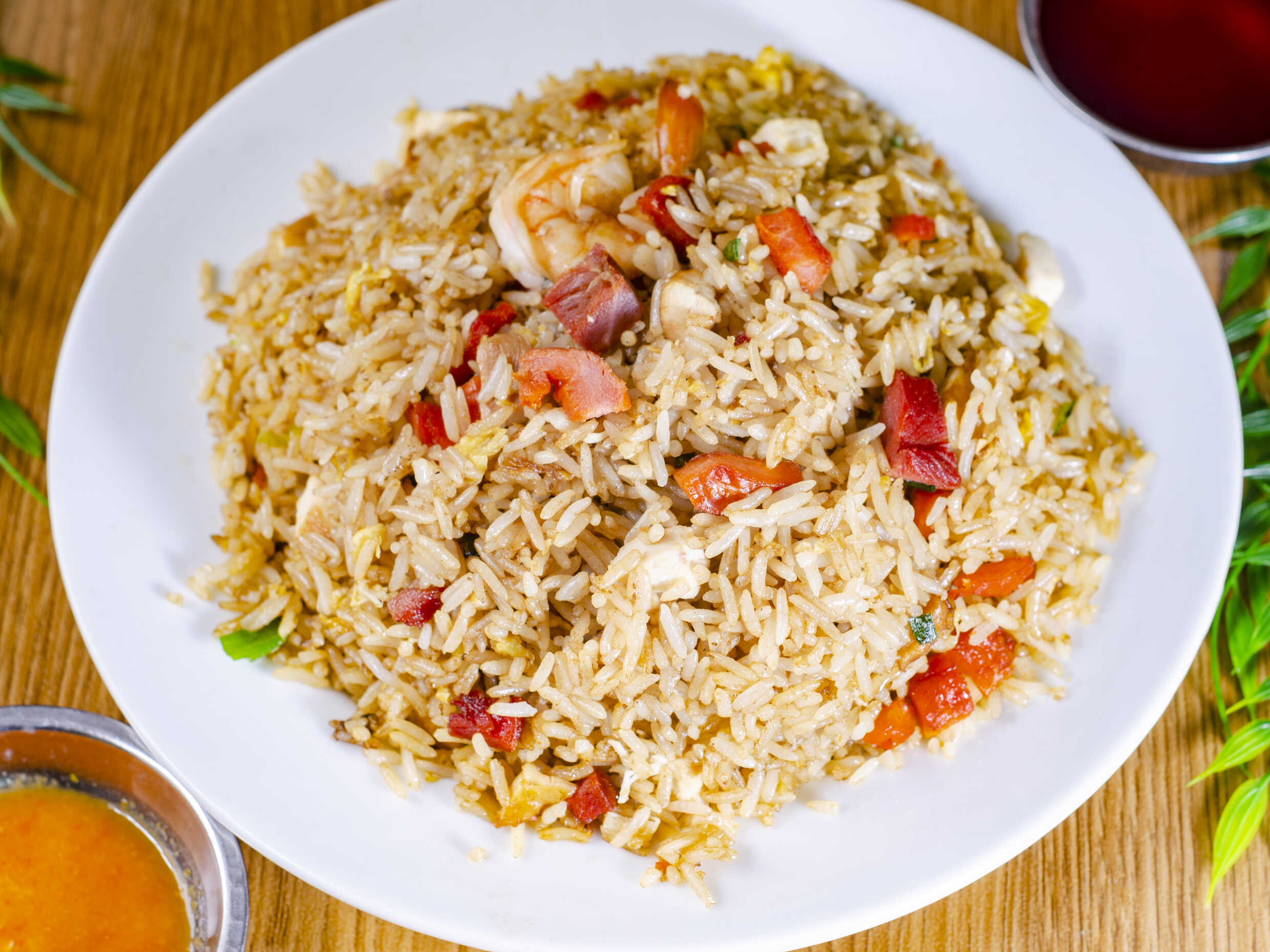 chaufa acompañado de langostino, pollo, chancho y carne. Incluye sopa wantán o wantán frito