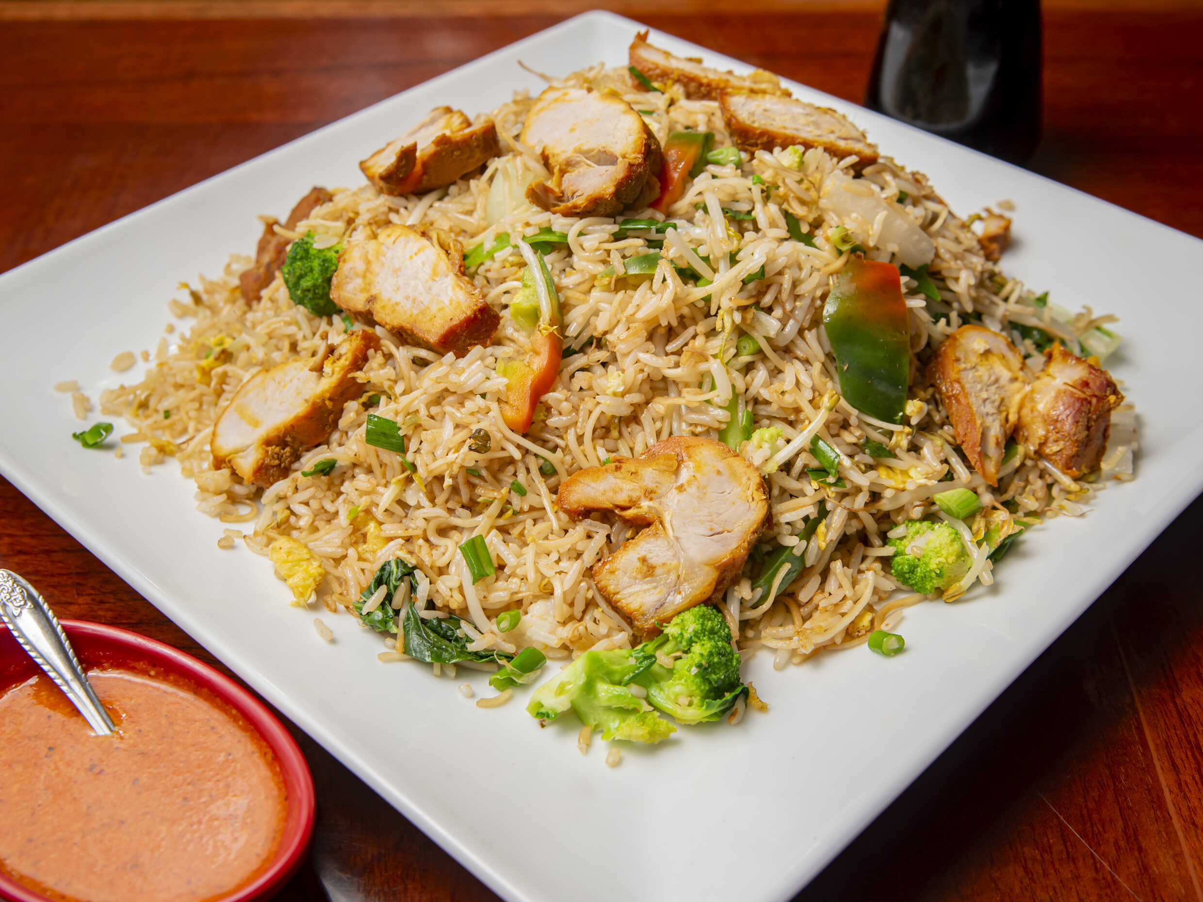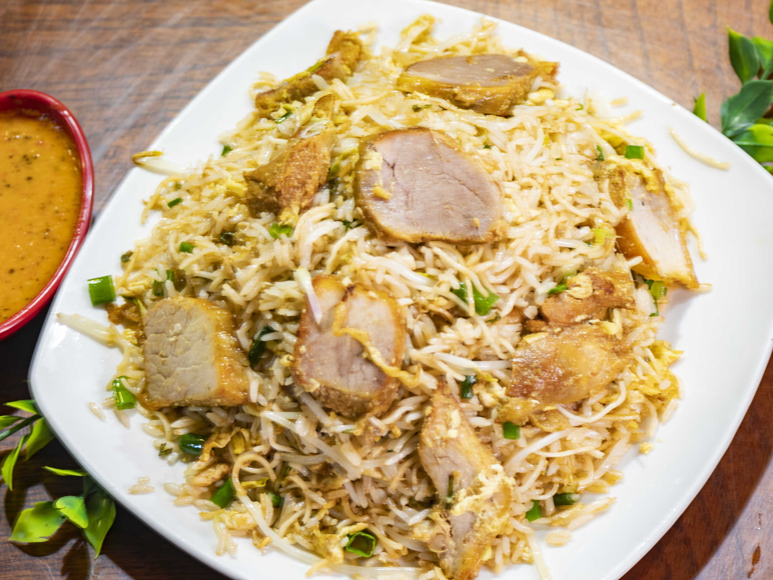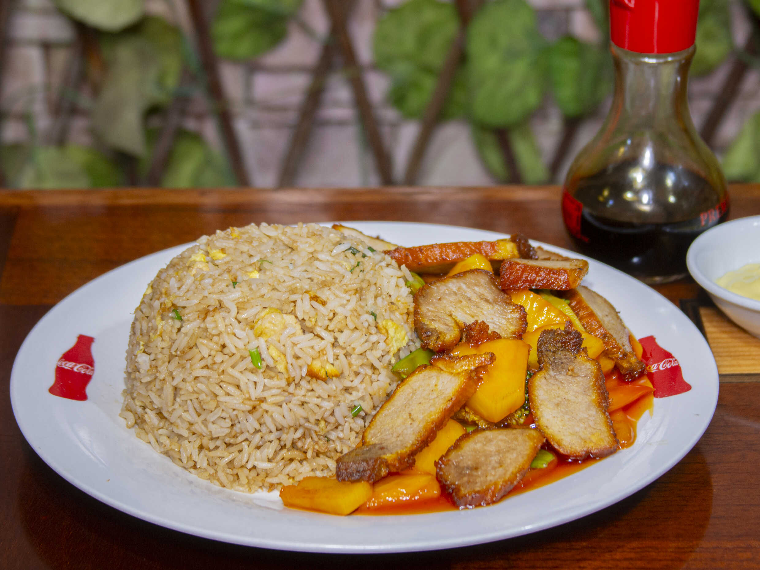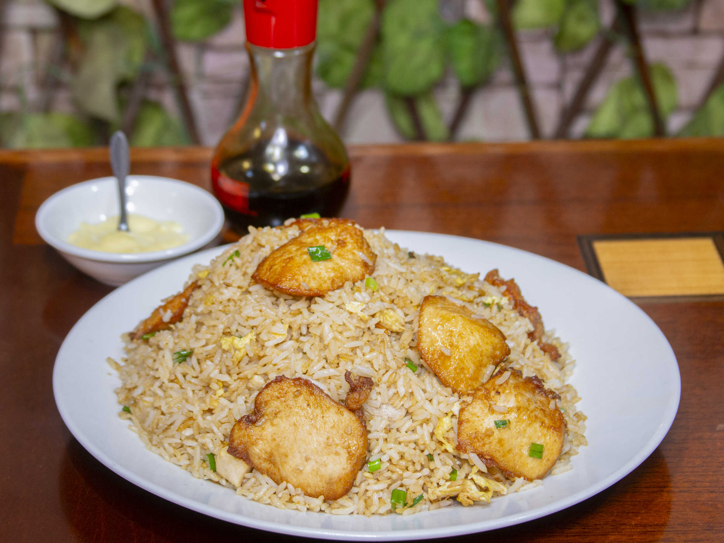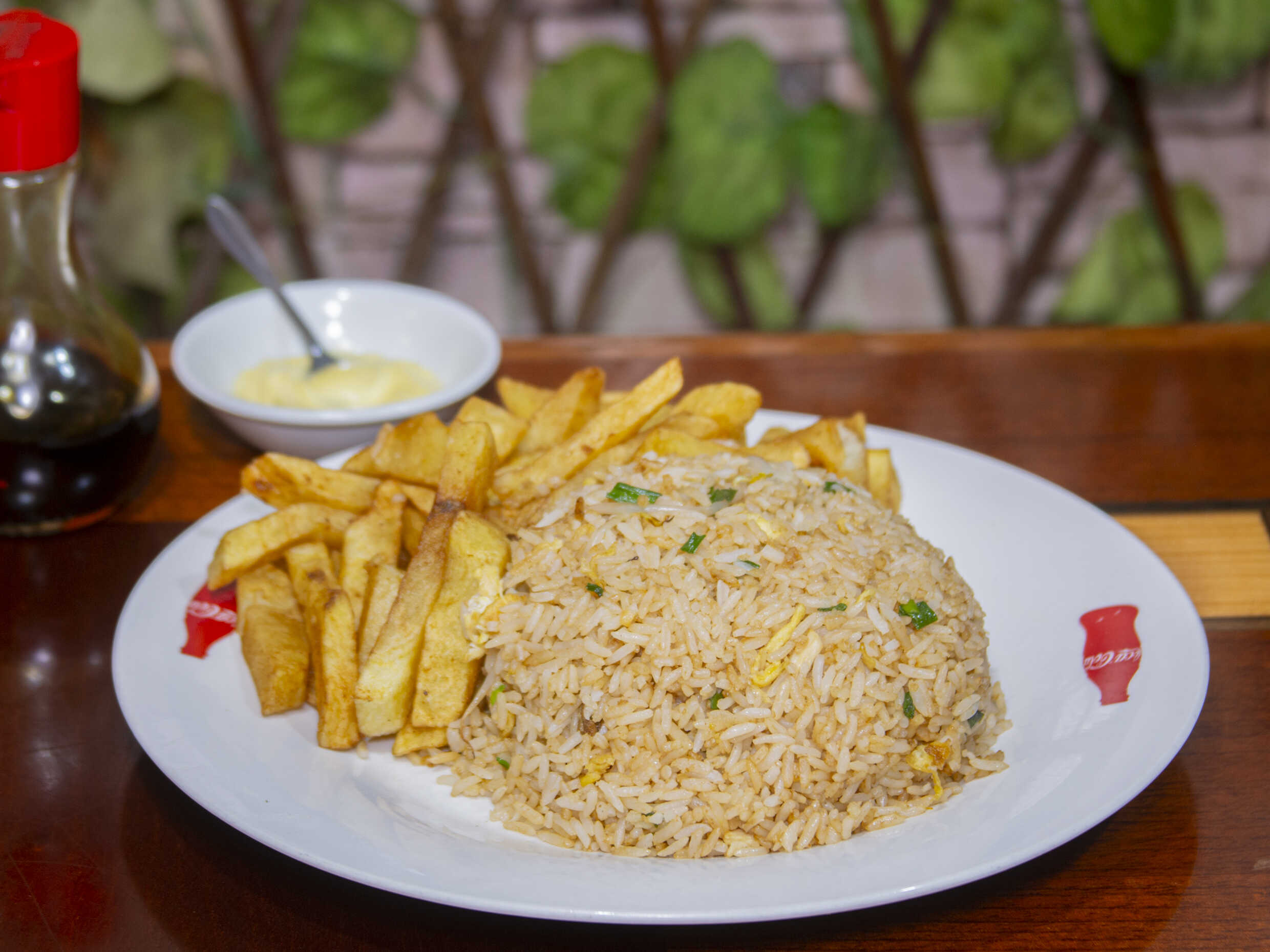 Arroz frito, chancho en trozos y cebolla china. Incluye sopa wantán o wantán frito.