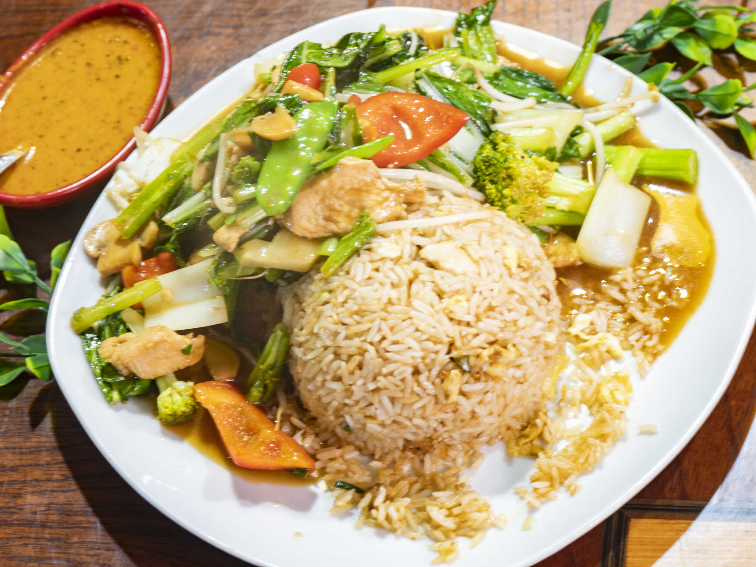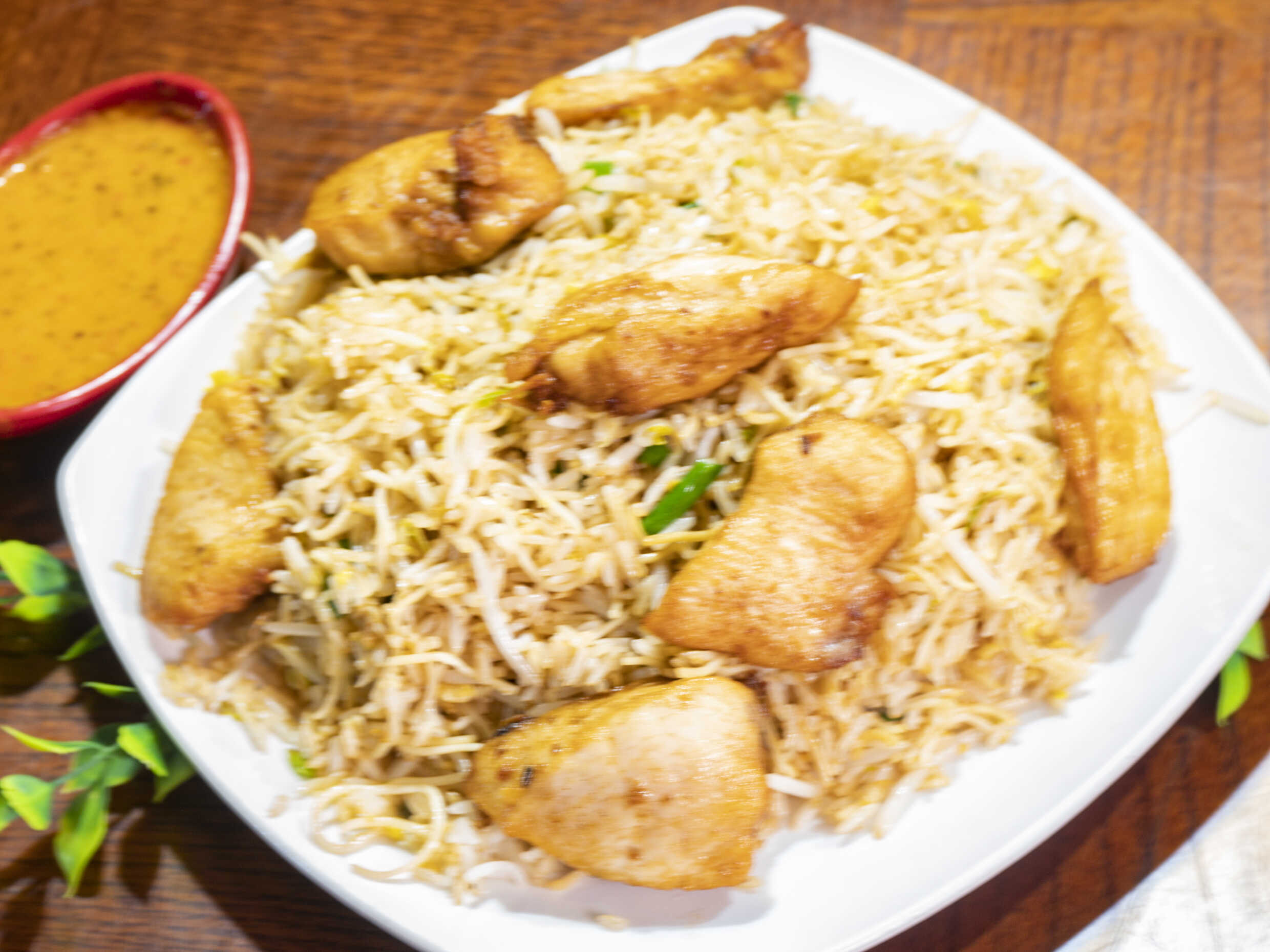 Arroz frito, pollo y cebolla china. Incluye sopa wantán o wantán frito.