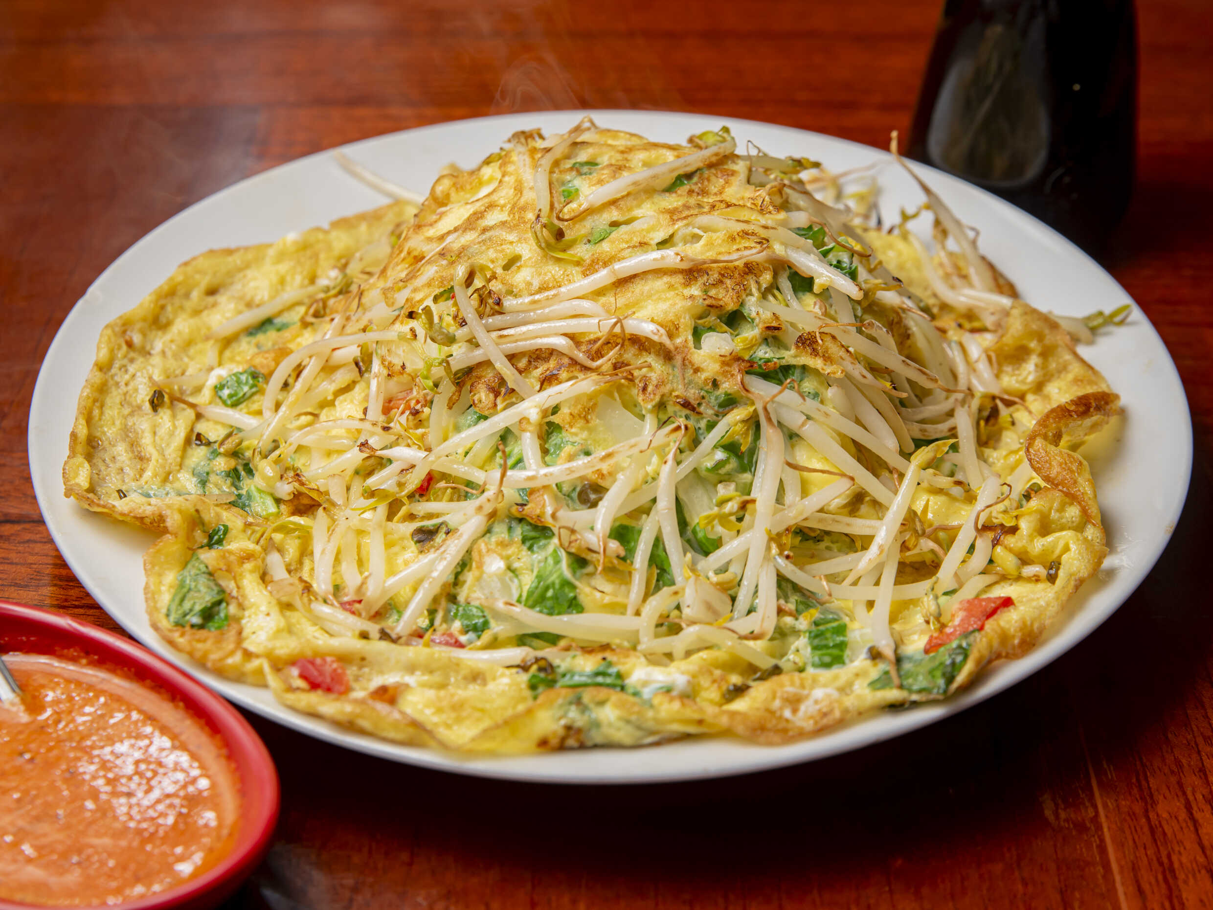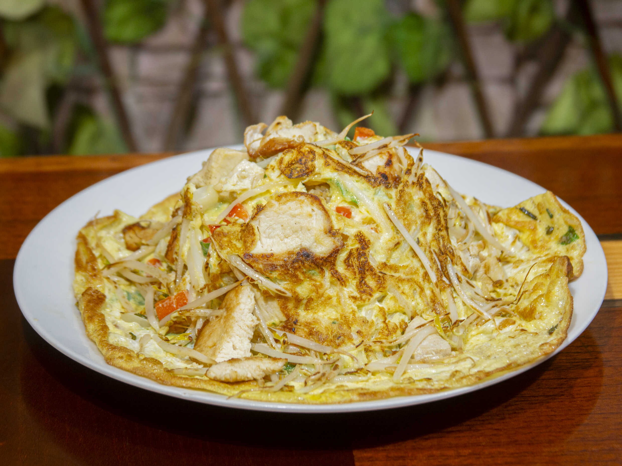Fideos chinos bañados en salsa de ostión con filete de pollo, chancho, carne, langostino y huevo de codorniz, mezclados con deliciosas verduras chinas. Incluye sopa wantán o wantán frito.