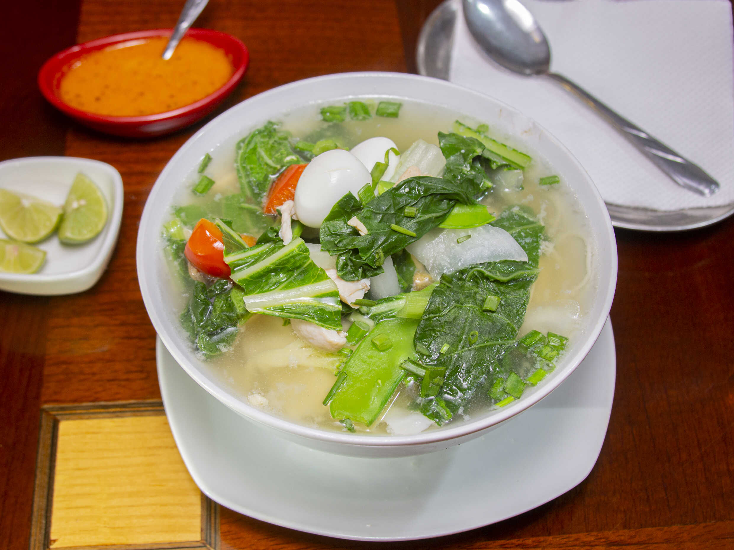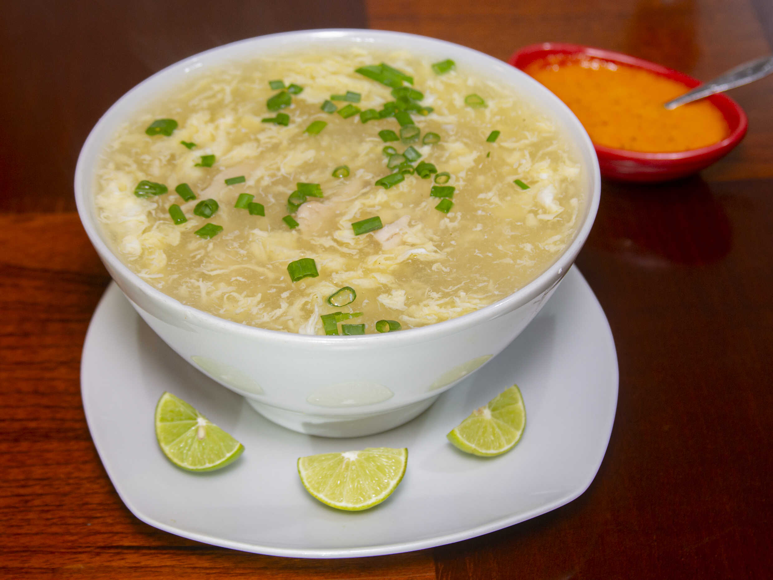 Caldo de pollo con trozos de pollo y claras de huevo.
