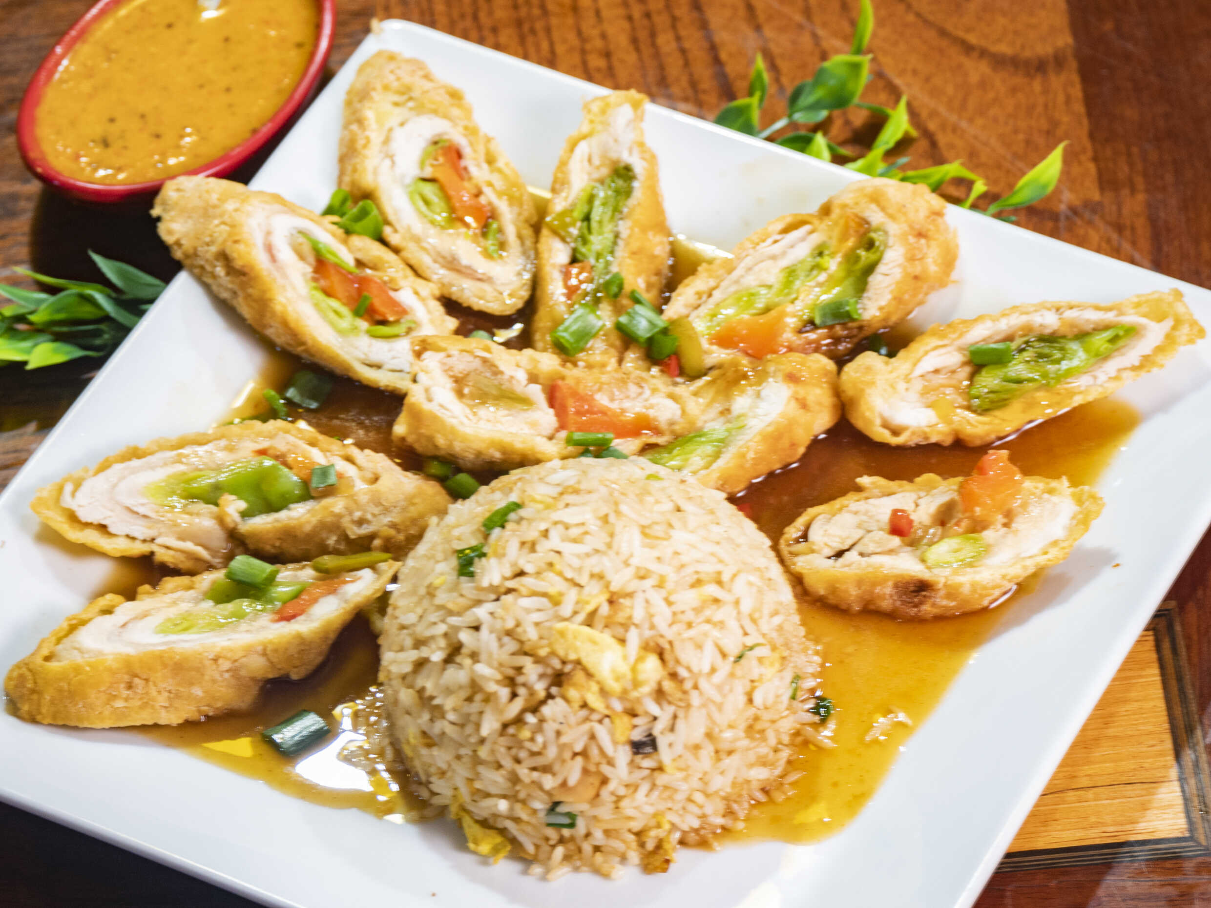 Chaufa y pollo enrollado. Incluye sopa wantán o wantán frito.