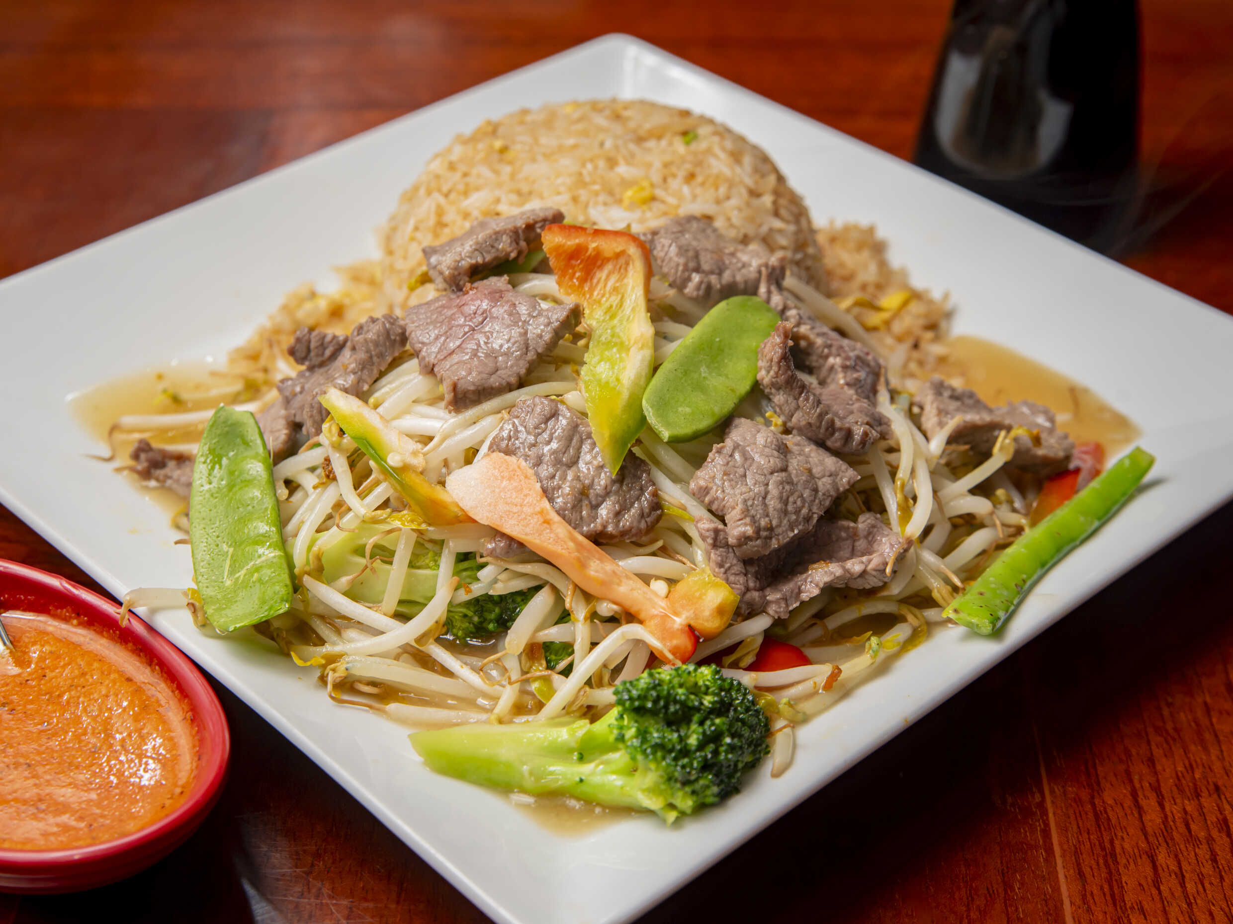 Fideos chinos bañados en salsa de ostión con filete de chancho, carne, langostino, pollo en trozos y huevo de codorniz, mezclados con deliciosas verduras chinas.Incluye sopa wantán o wantán frito.