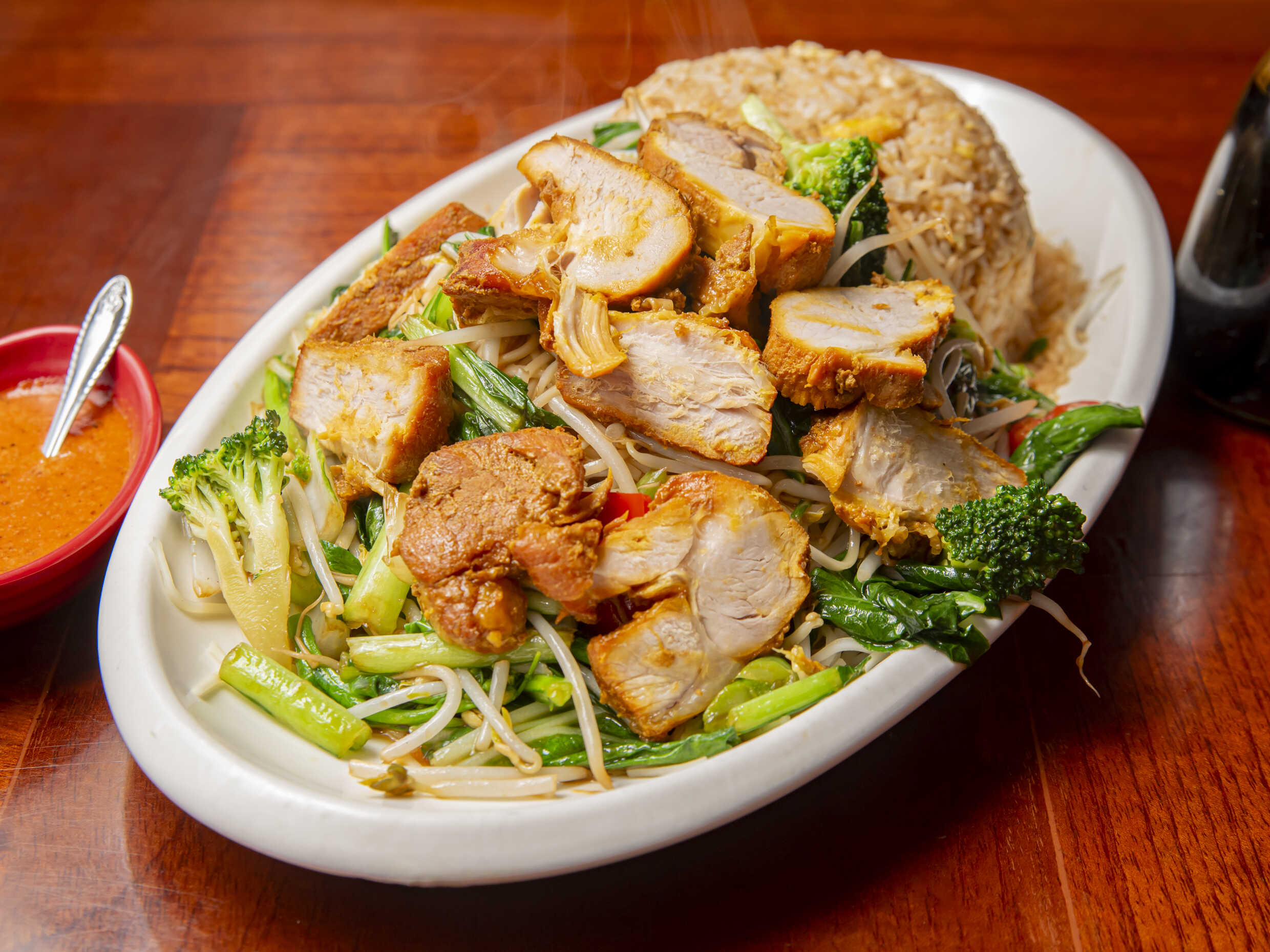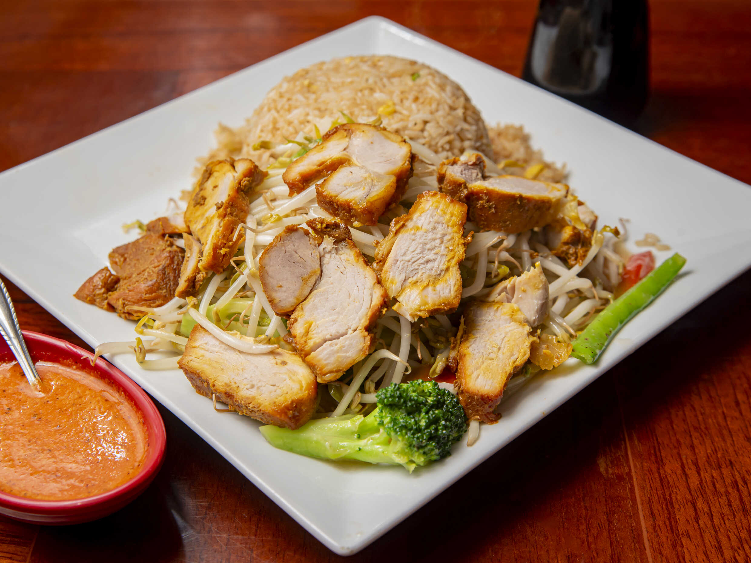Arroz chaufa de pollo en trozos, combinado de frijol chino y tallarín. Incluye sopa wantán o wantán frito.