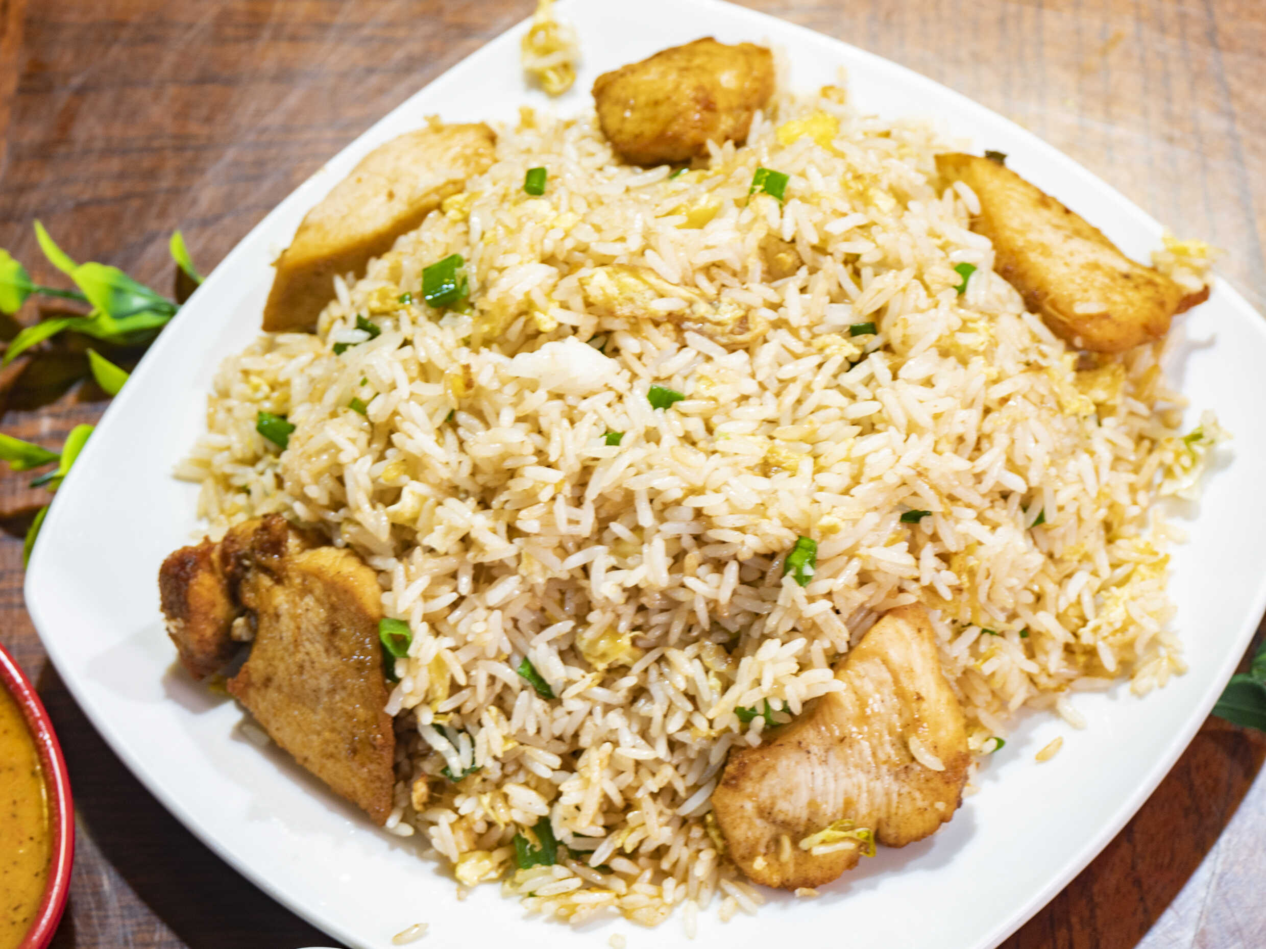 Arroz frito y pollo en trozos. Incluye sopa wantán o wantán frito.