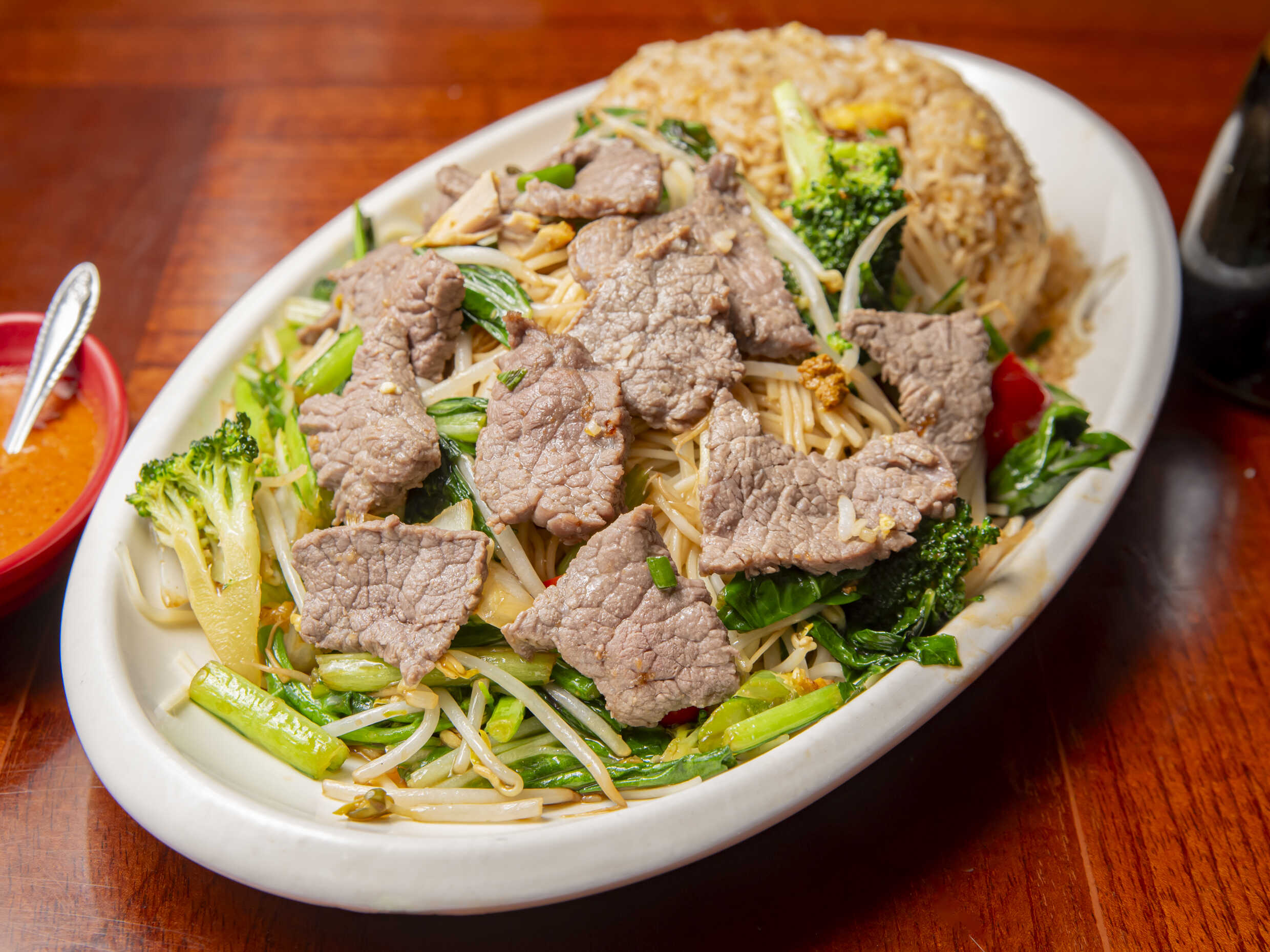Arroz chaufa, tallarín y carne. Incluye sopa wantán o wantán frito.