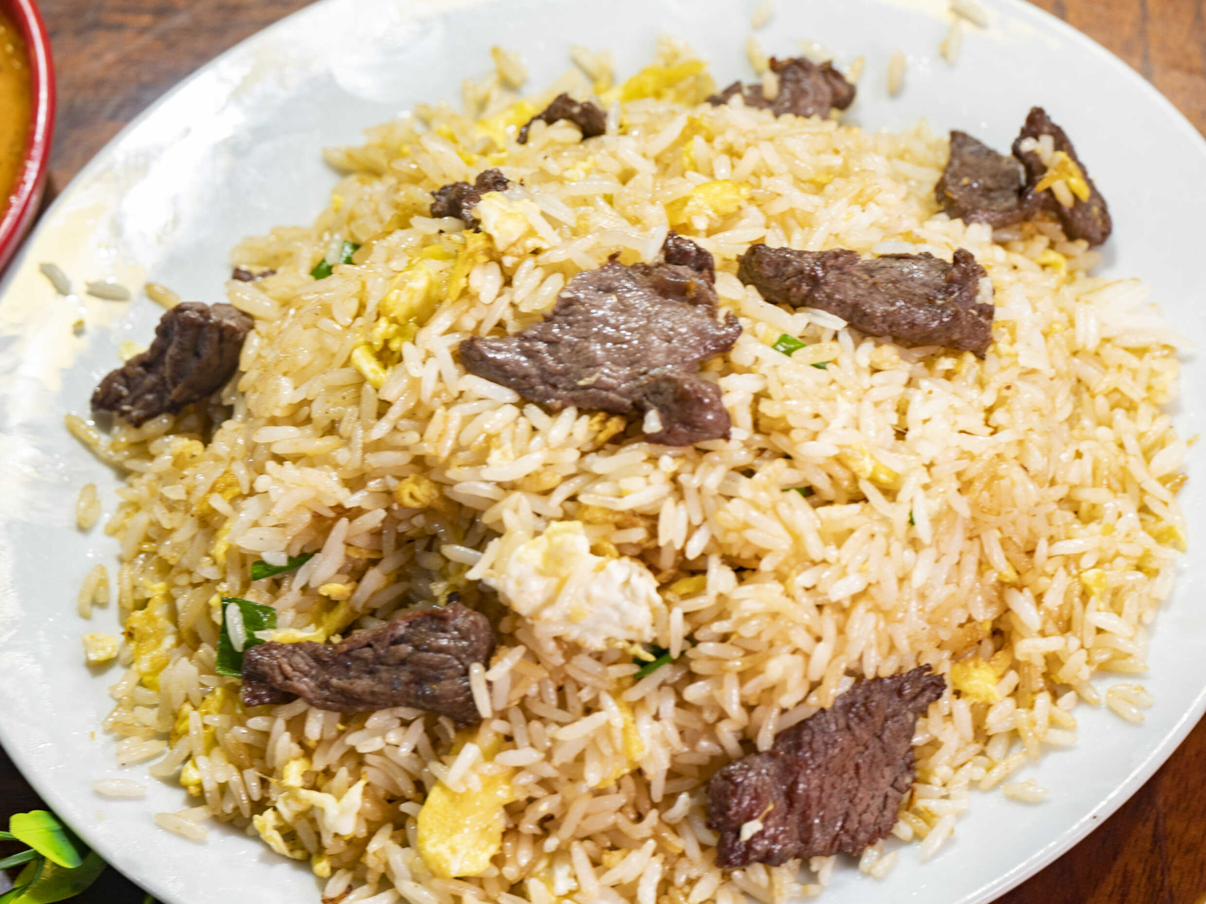 Arroz frito, carne y cebolla china. Incluye sopa wantán o wantán frito.