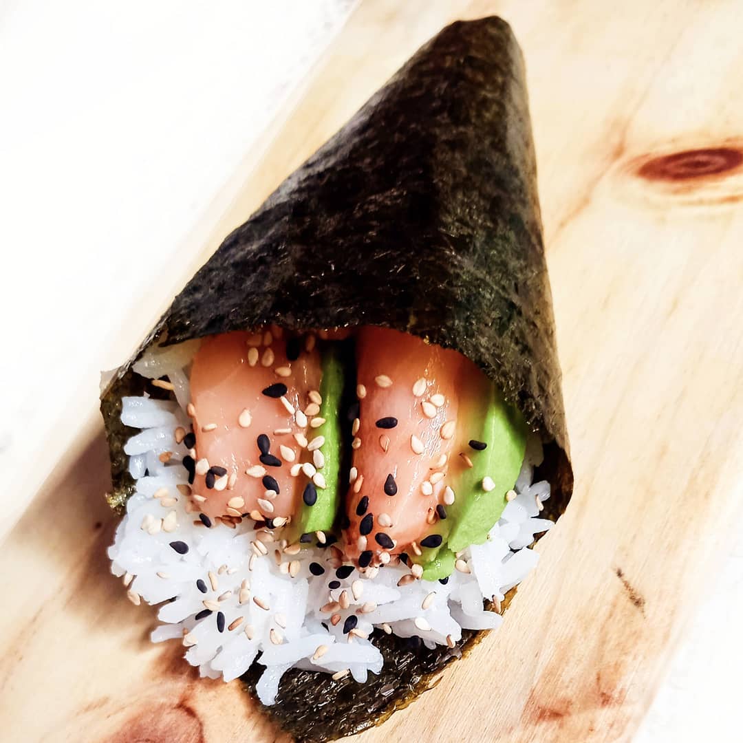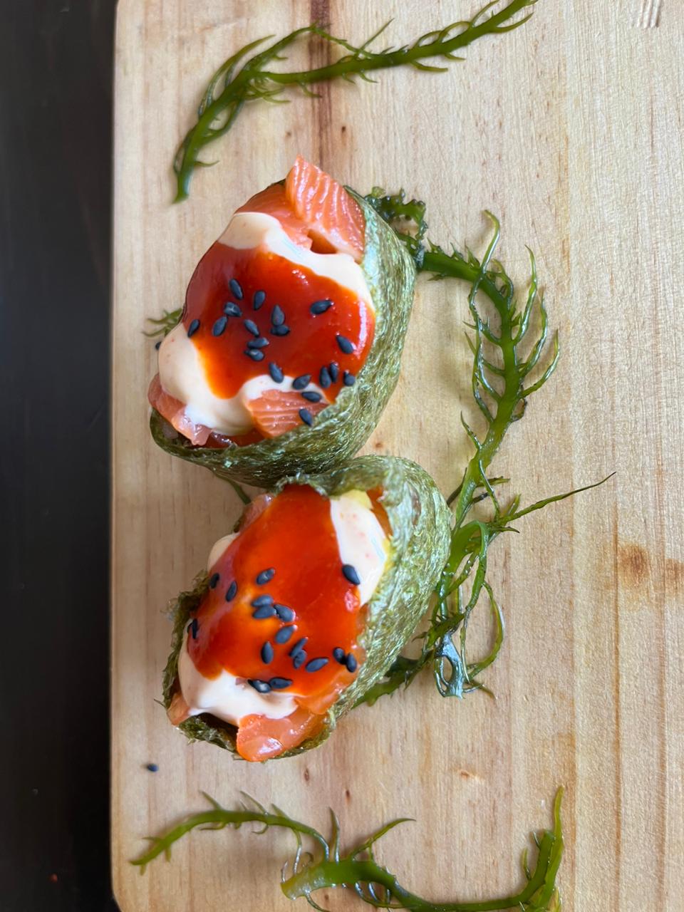 Cono de alga nori relleno de arroz sushi, tiras de salmón y palta bañado en semillas de ajonjolin