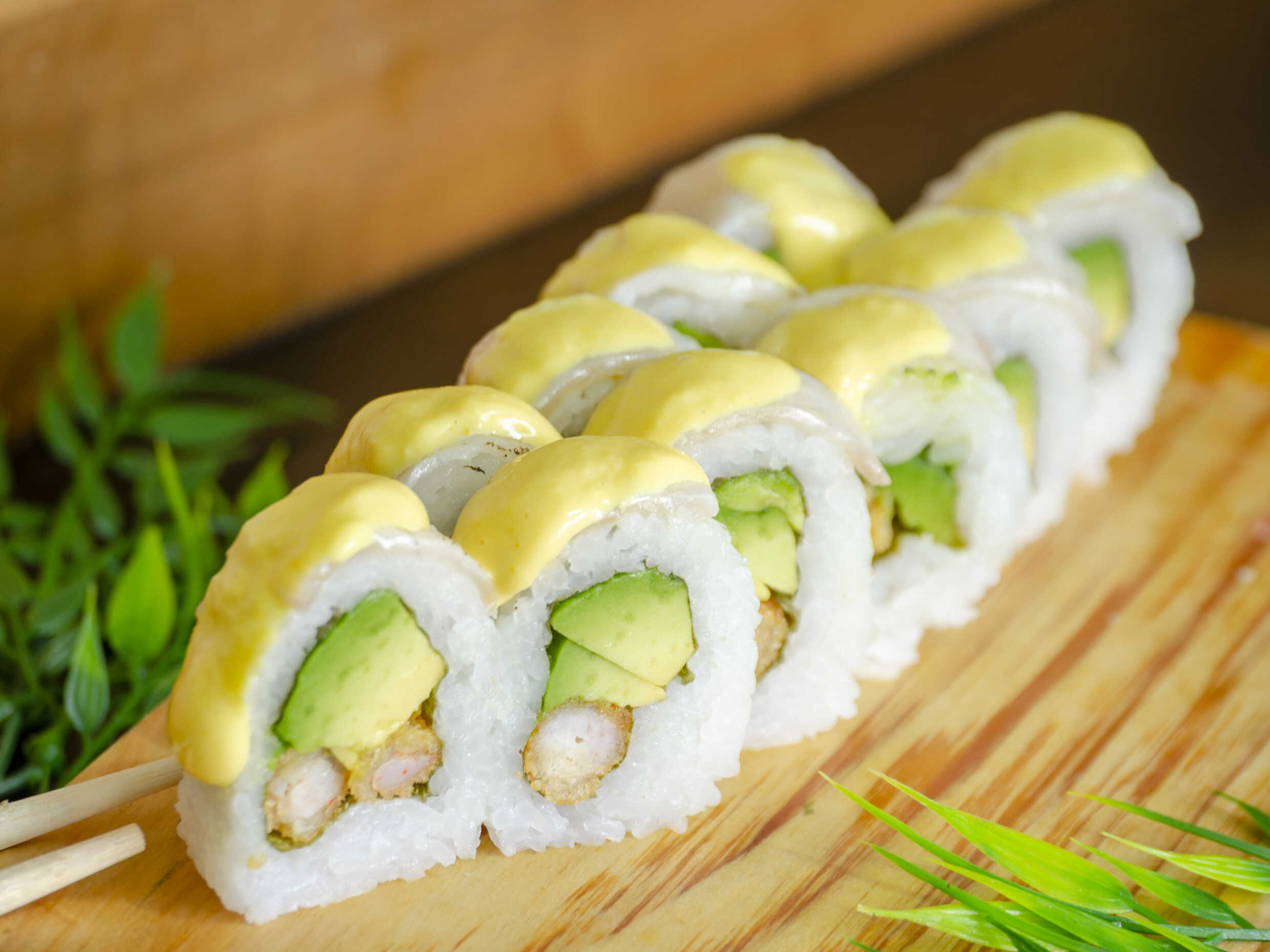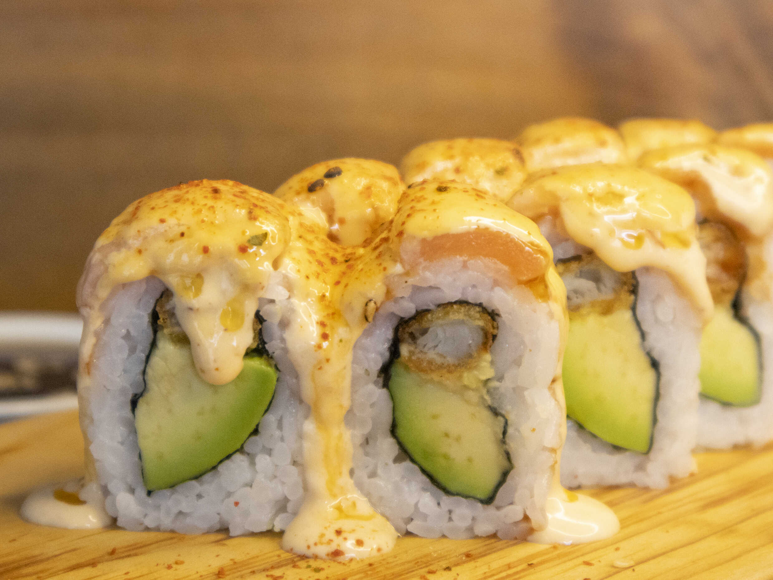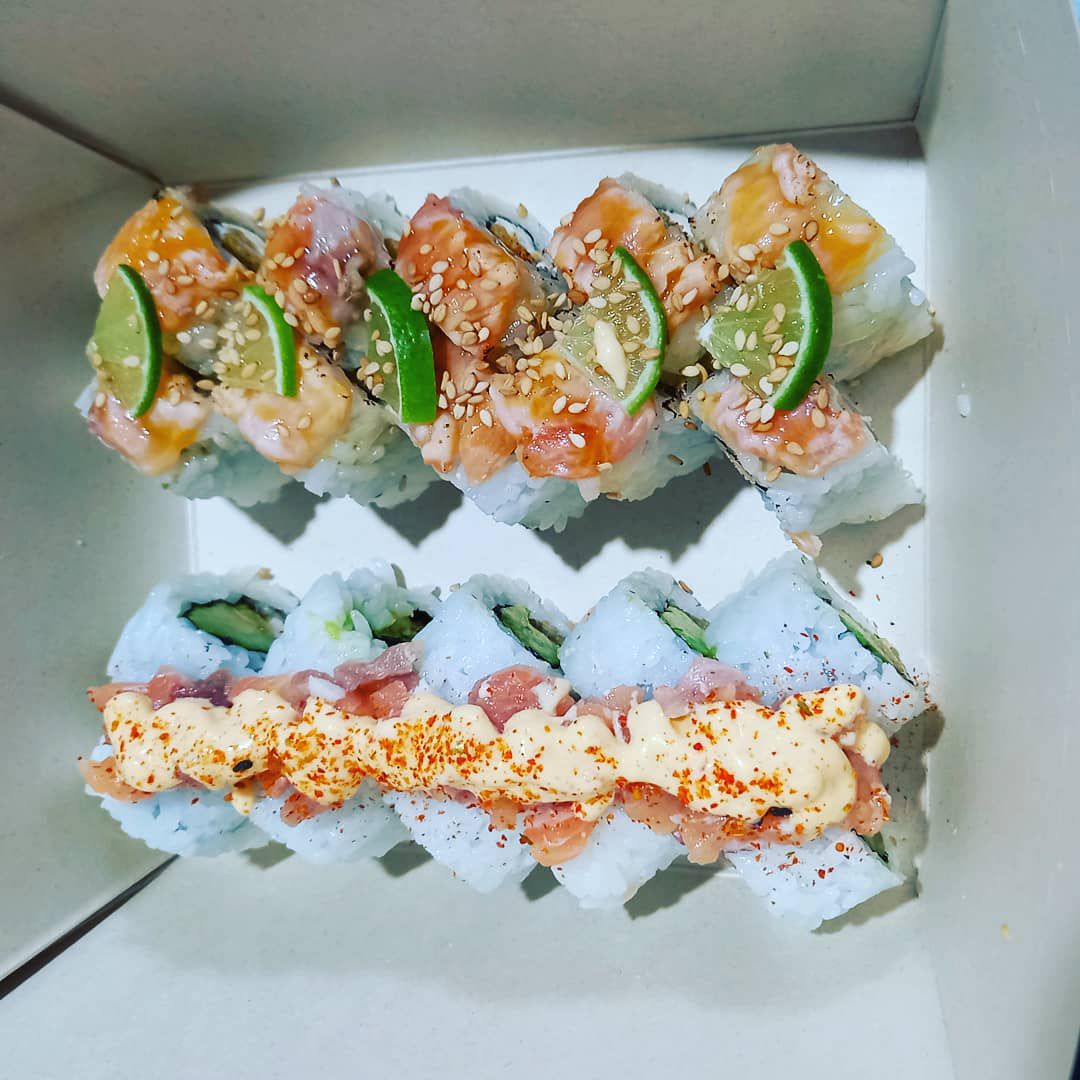Maki relleno de langostino empanizado, palta cubierto de atún y bañado en crema huancaína.