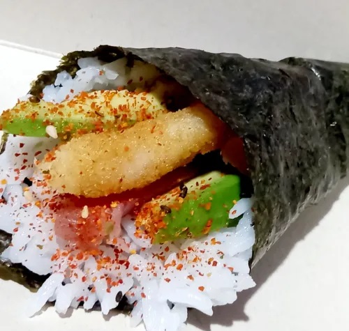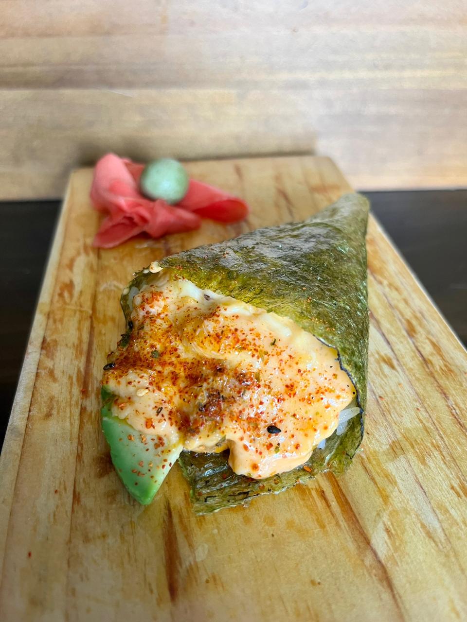 Cono de alga nori relleno de arroz sushi, Langostino empanizado, palta bañado en pulpa de cangrjo