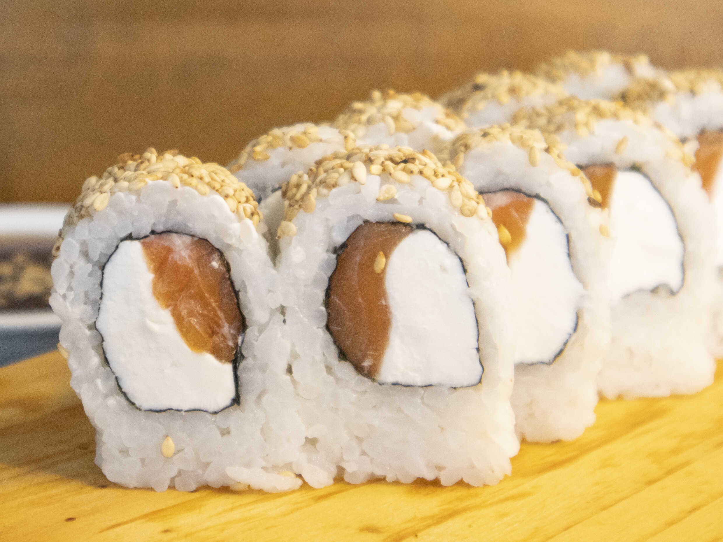 Maki relleno de salmón, palta, queso crema cubierto de semillas de ajonjolí.