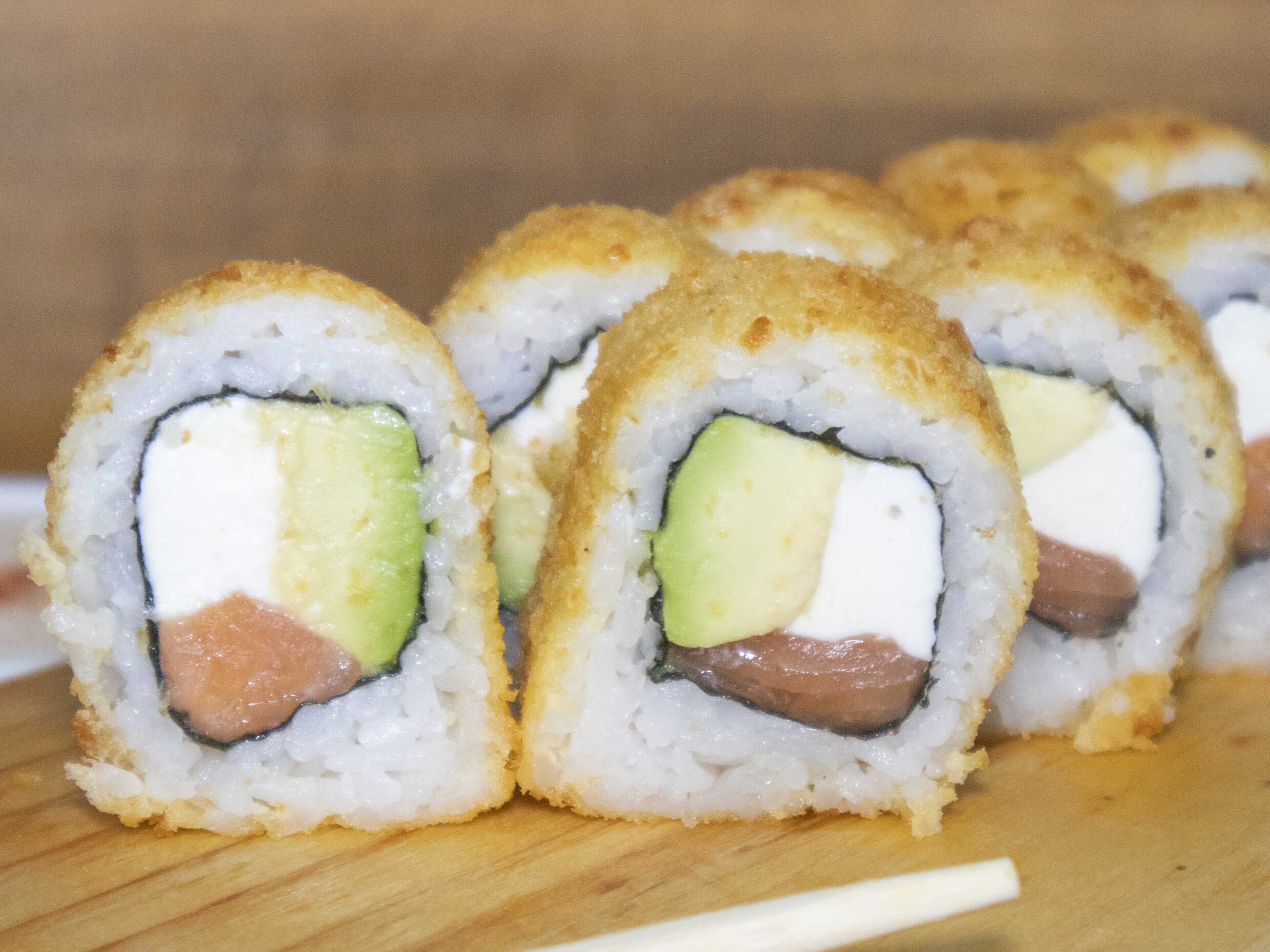 Maki relleno de queso crema, palta, salmón empanizado y frito.
