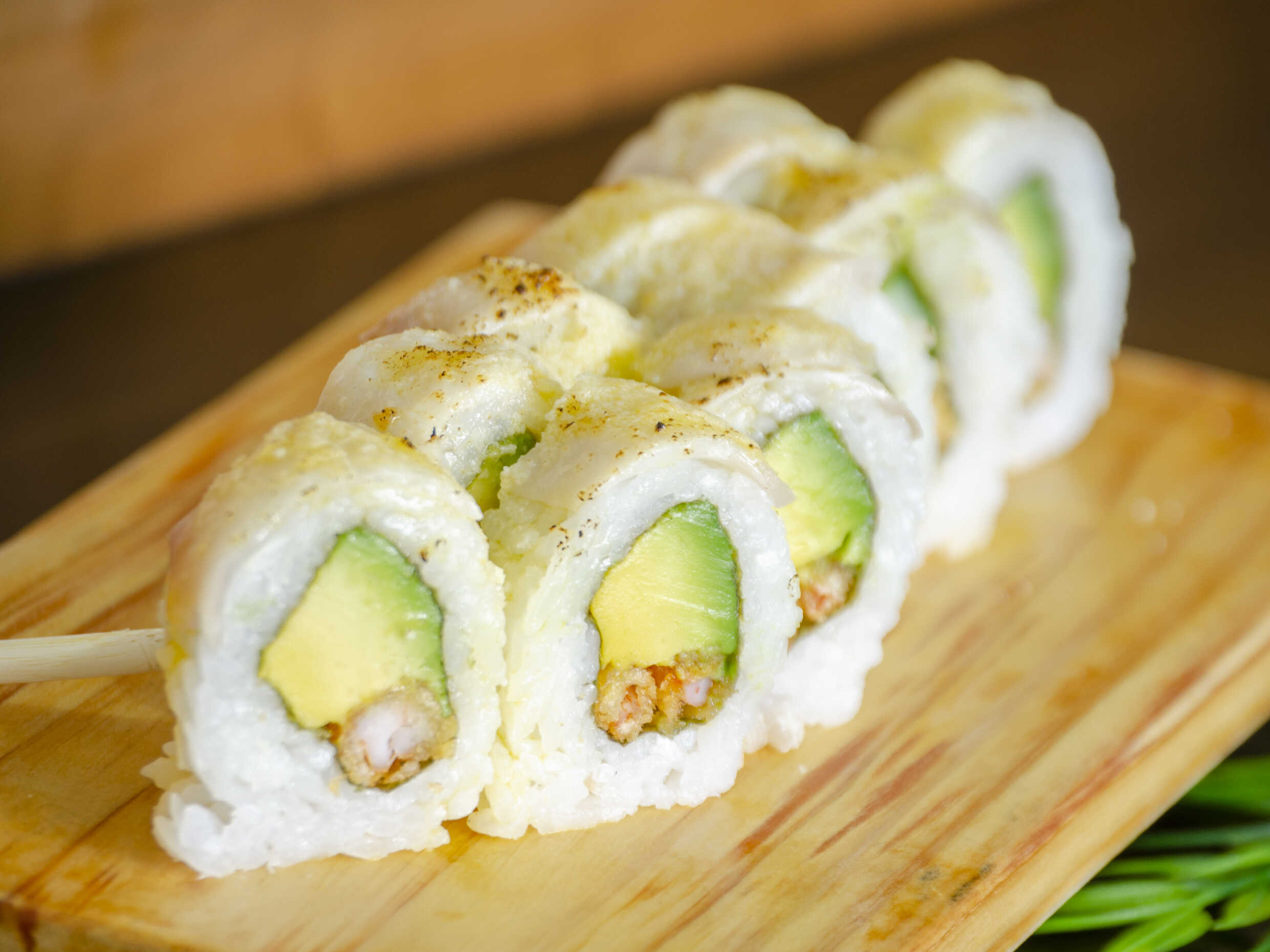 Maki relleno de palta, langostino empanizado, cubierto de láminas de conchas de abanico con queso a la parmesana, flameado en mantequilla.