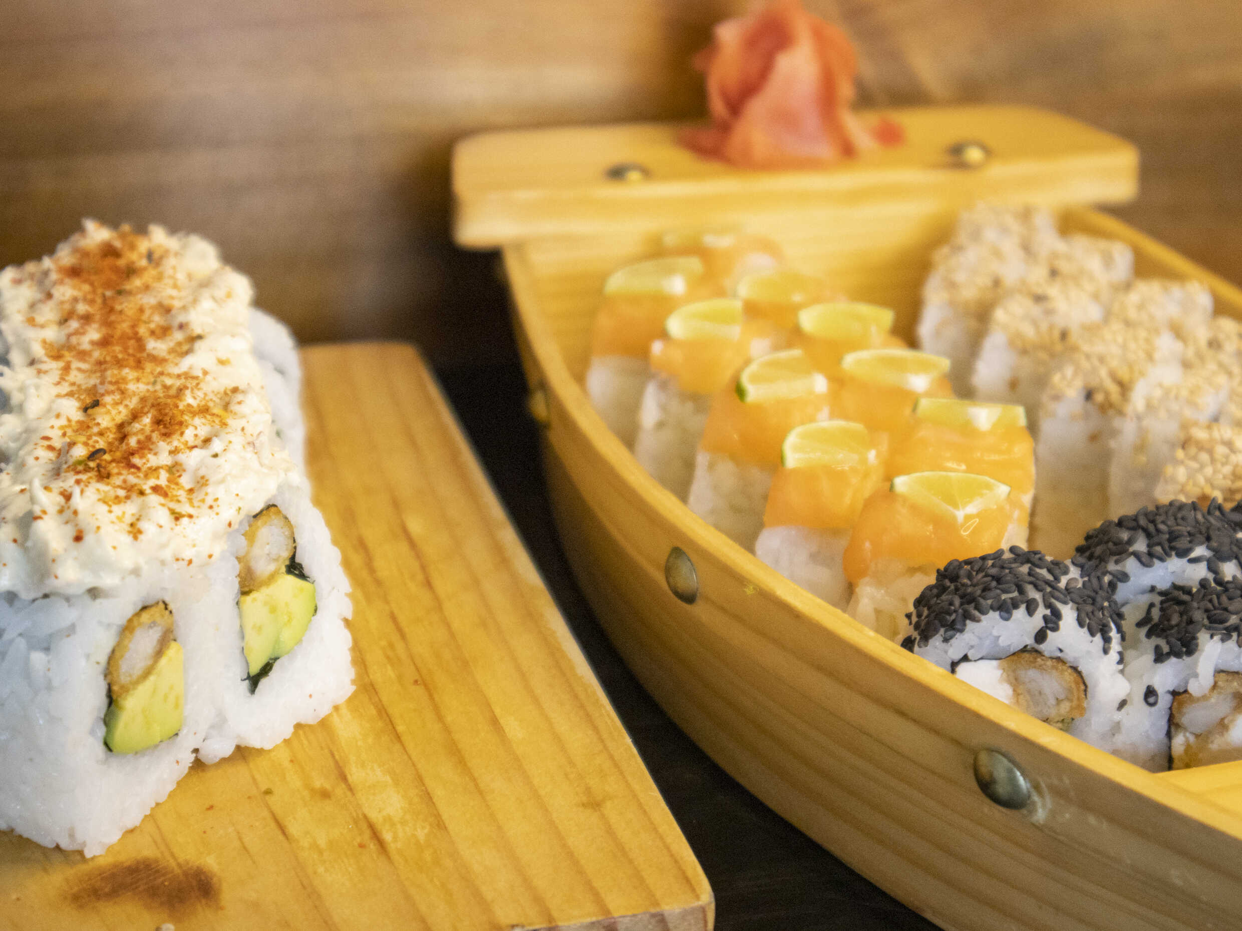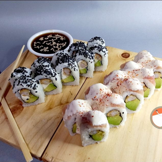 Maki relleno de palta, langostino empanizado cubierto de salmón y flameado en salsa tradicional.