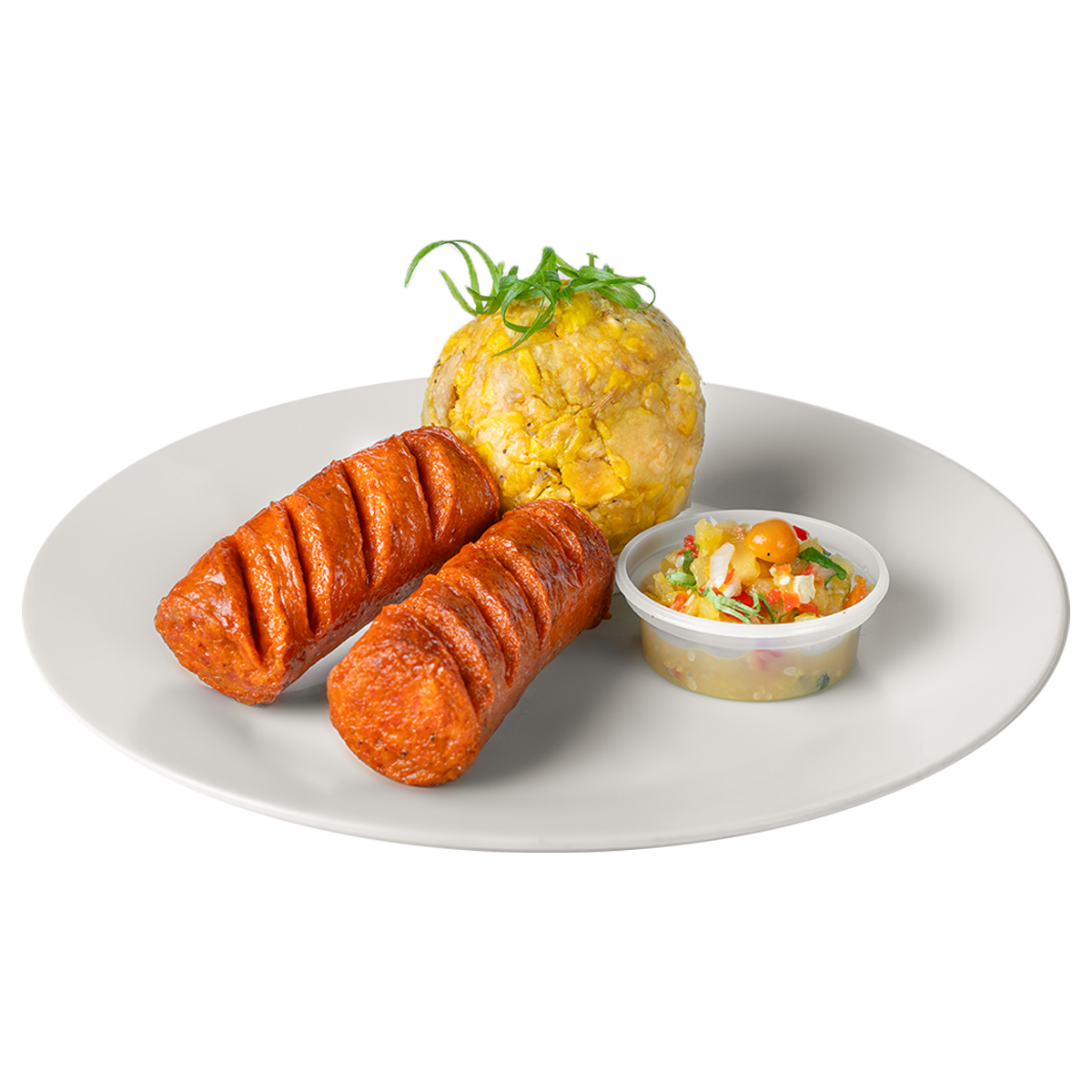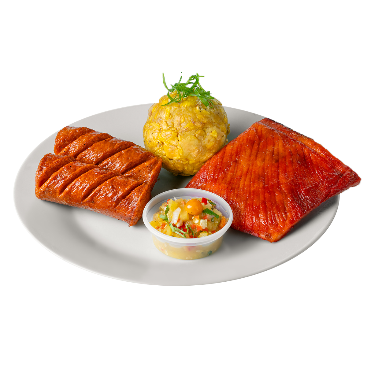 Tacacho, maduro, chorizo, cecina, chaufa amazónico, acompañado de ají charapita.