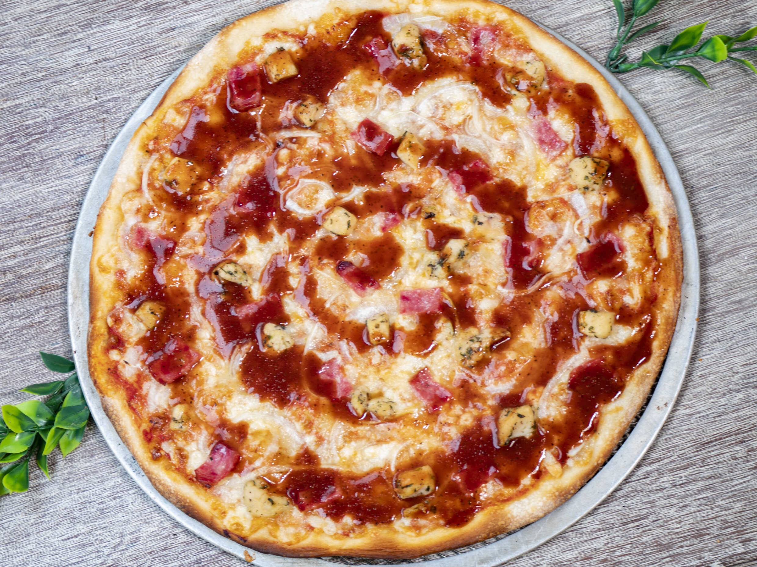 Pizza en masa artesanal de 30 cm, salsa de tomate italiana, mozzarella, pollo, tocino, cebolla blanca y BBQ.