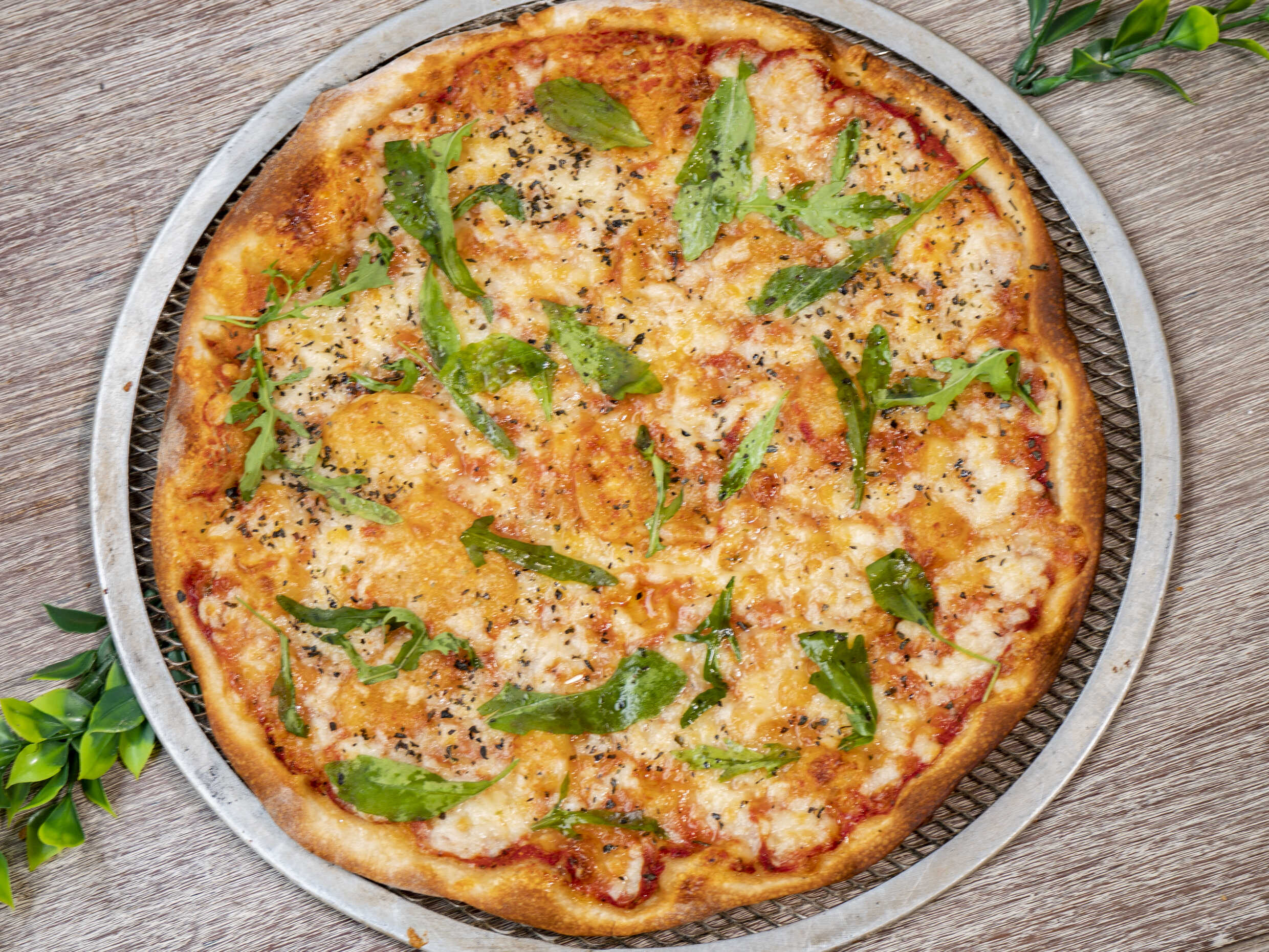 Pizza en masa artesanal de 30 cm, salsa de tomate italiana, mozzarella, aceite de olvida, arugula o albahaca.