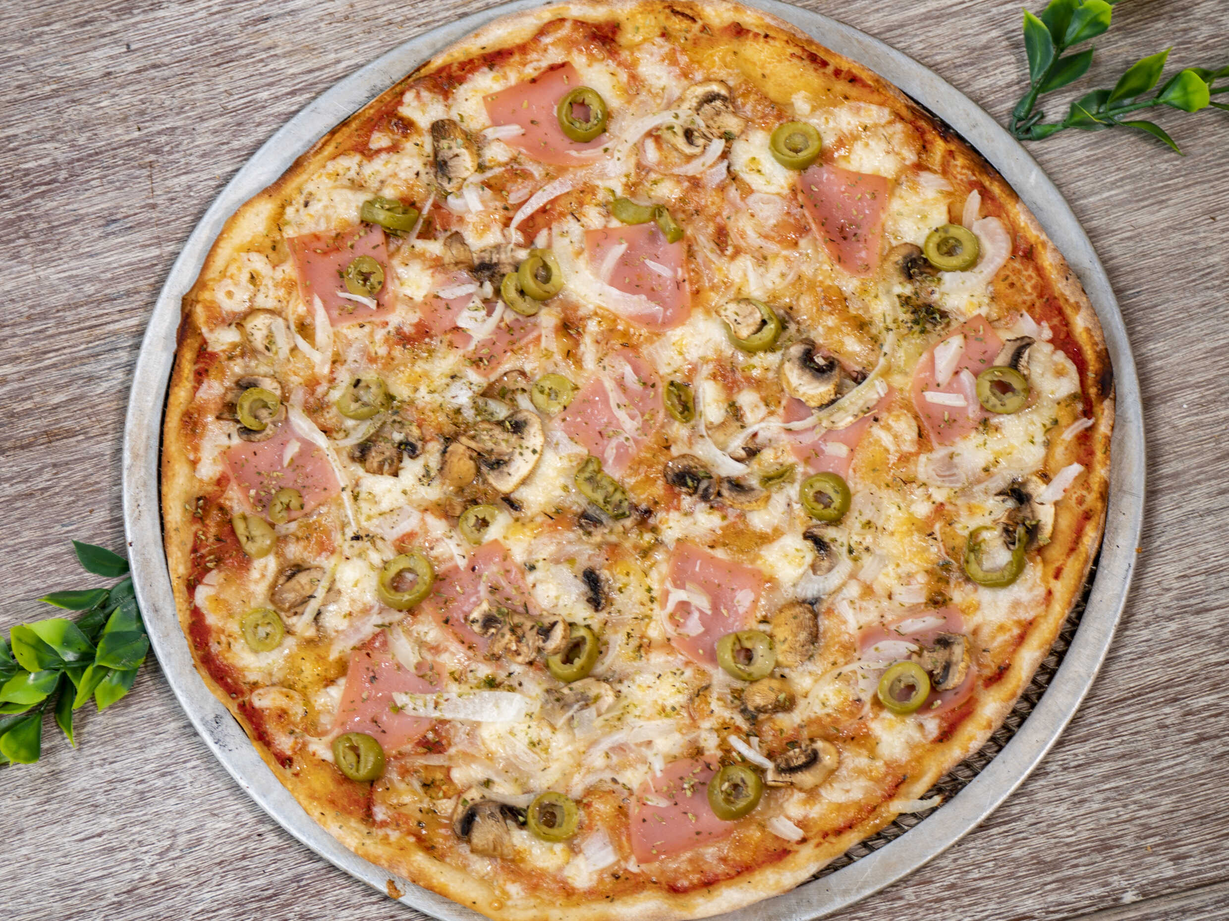Pizza en masa artesanal de 36 cm, salsa de tomate italiana, mozzarella, cebolla, jamón, champiñones y aceituna.