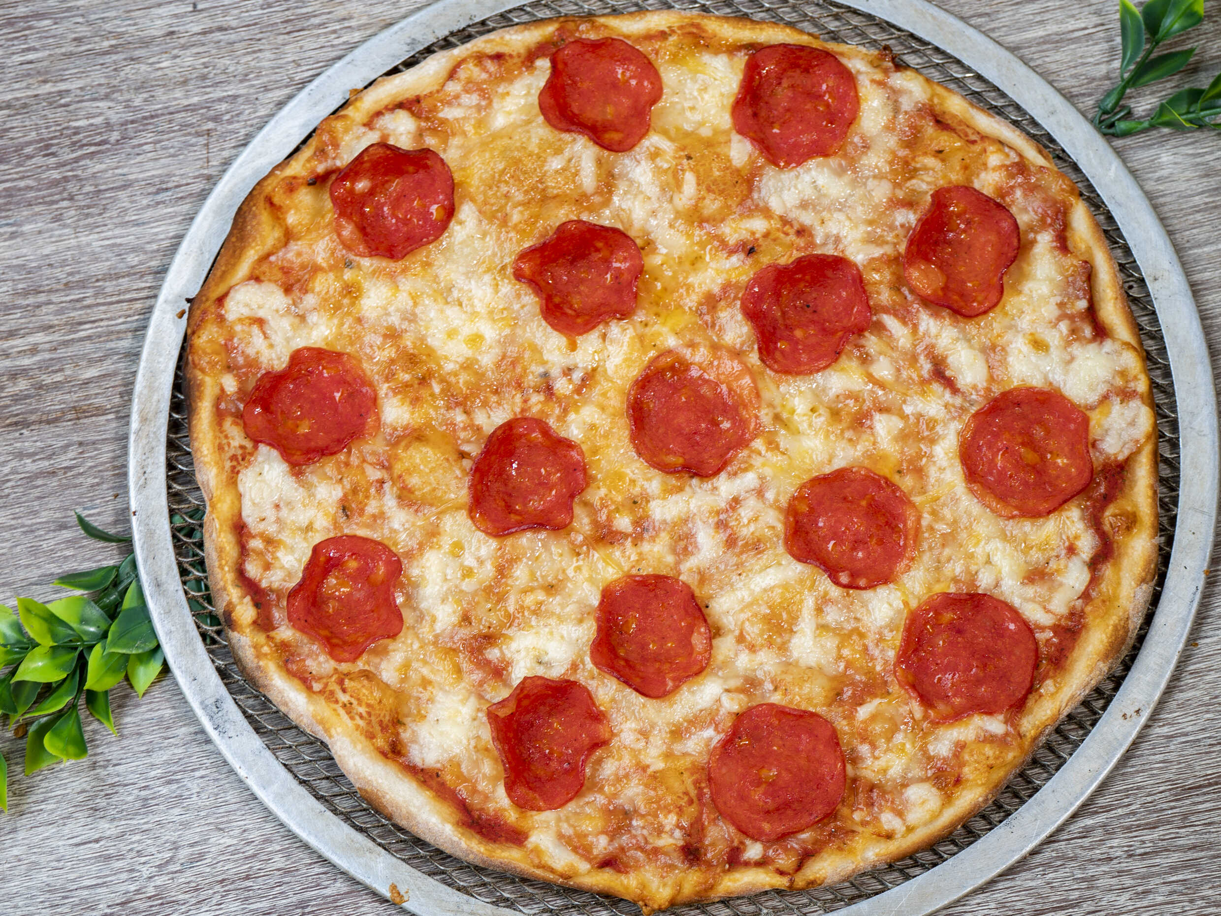 Pizza en masa artesanal de 30 cm, salsa de tomate italiana, mozzarella y pepperoni.