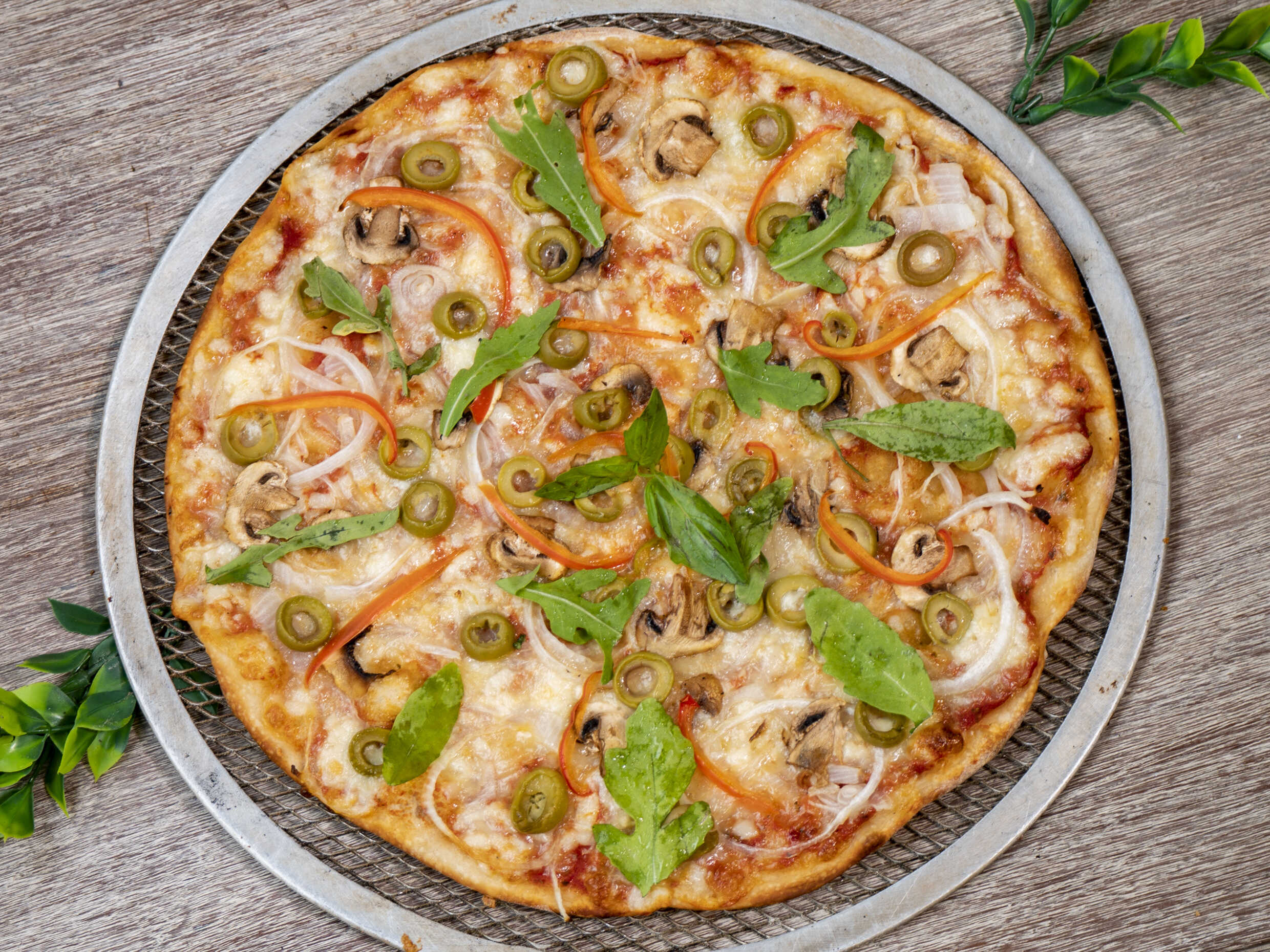 Pizza en masa artesanal de 30 cm, salsa de tomate italiana, cebolla blanca, champiñones, pimiento, aceituna verde y arúgula.