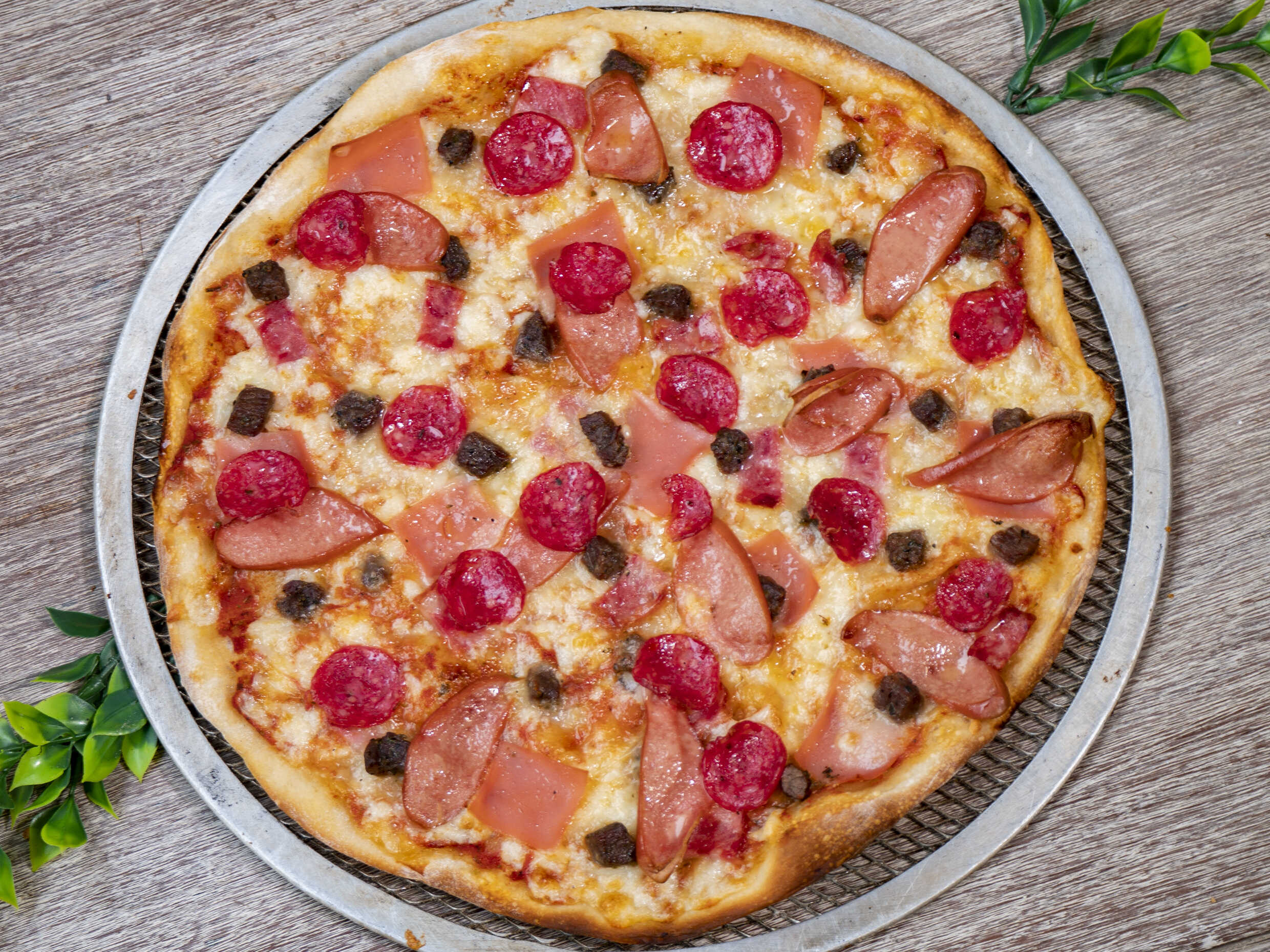 Pizza en masa artesanal de 30 cm, salsa de tomate italiana, mozzarella, jamón, tocino, chorizo, champiñón, frankfurter y carne cuadril flameada.